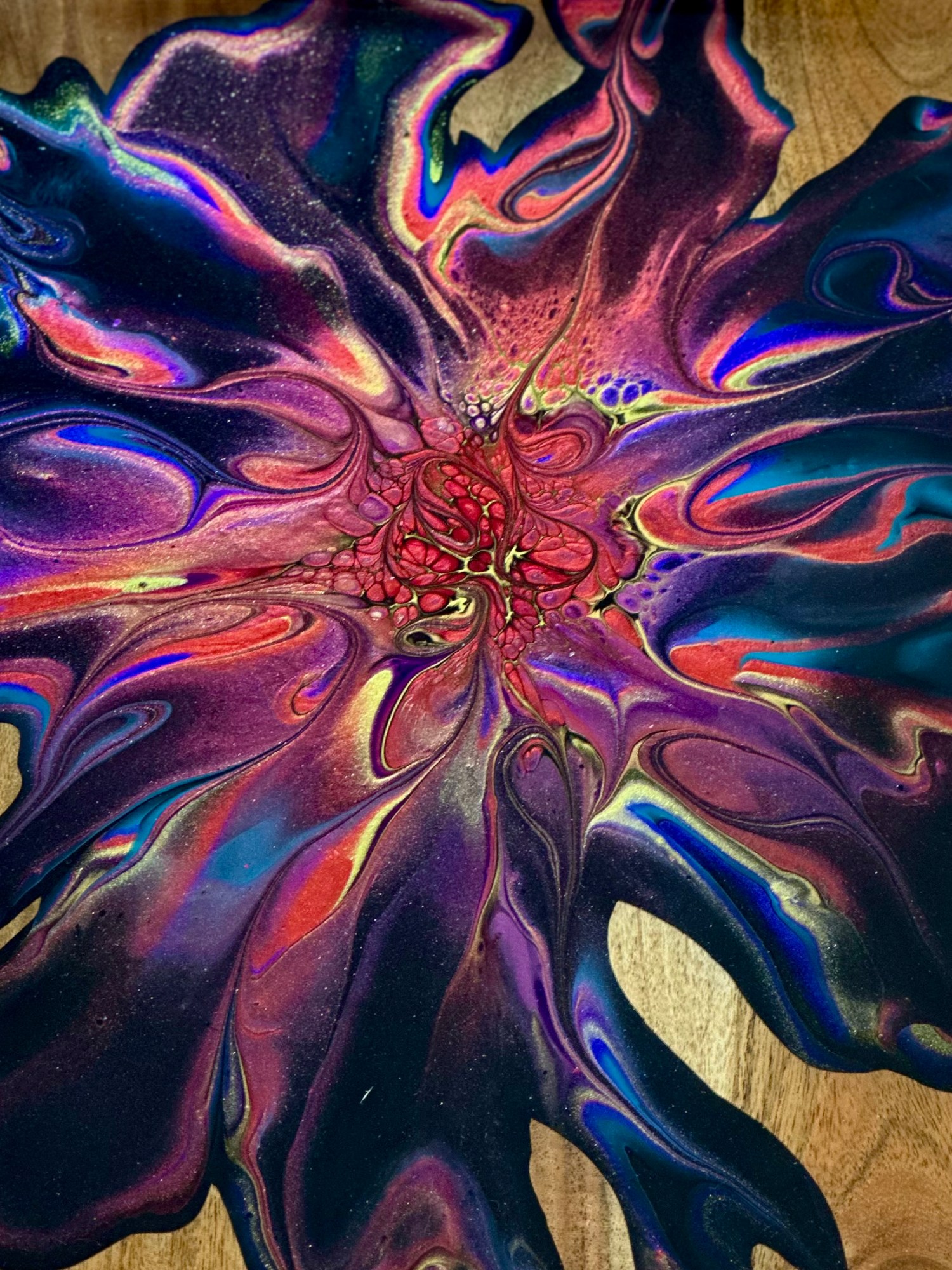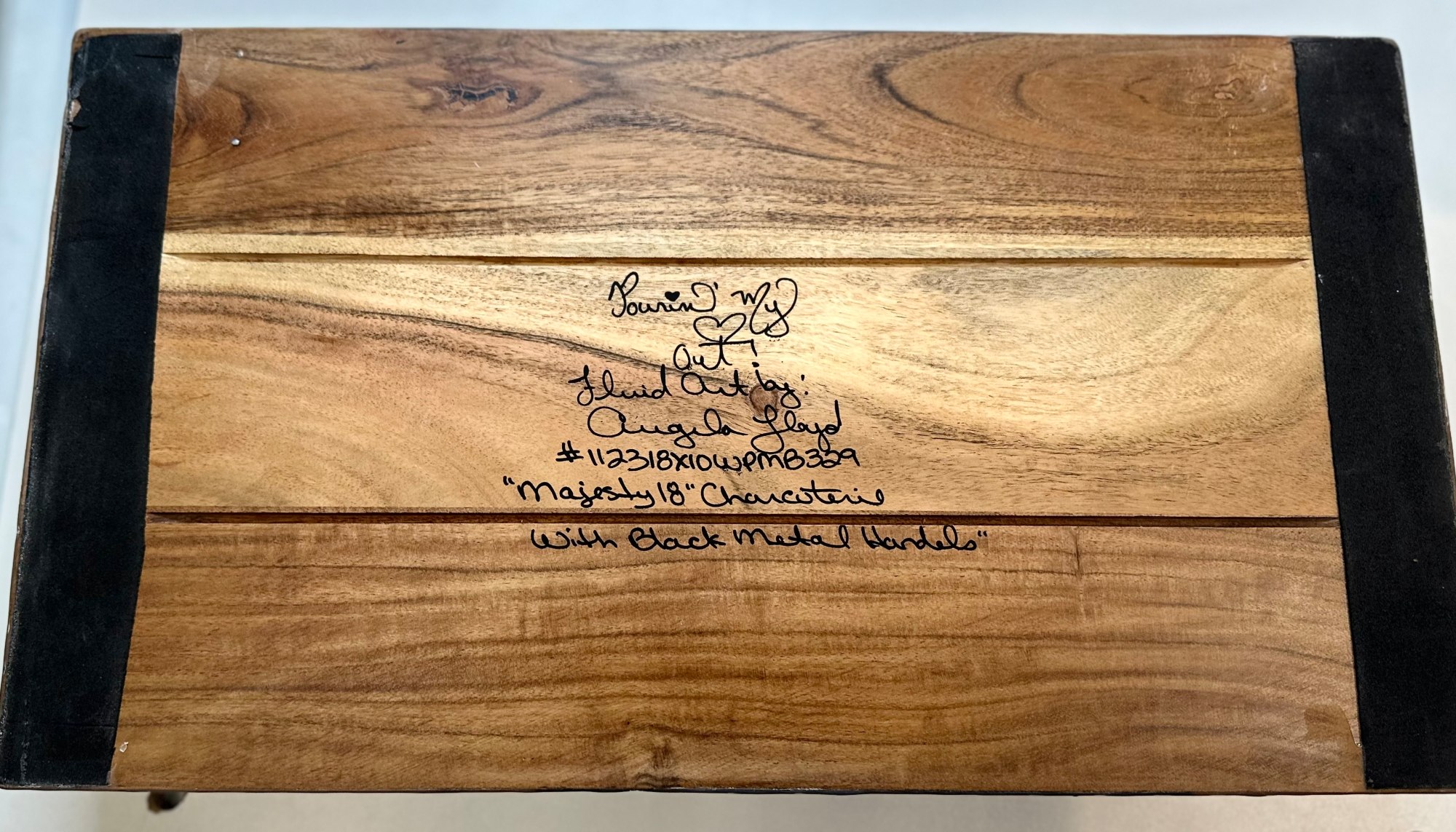 Acrylic Paint, mica pigments, and resin on acacia wood platter with metal handles.