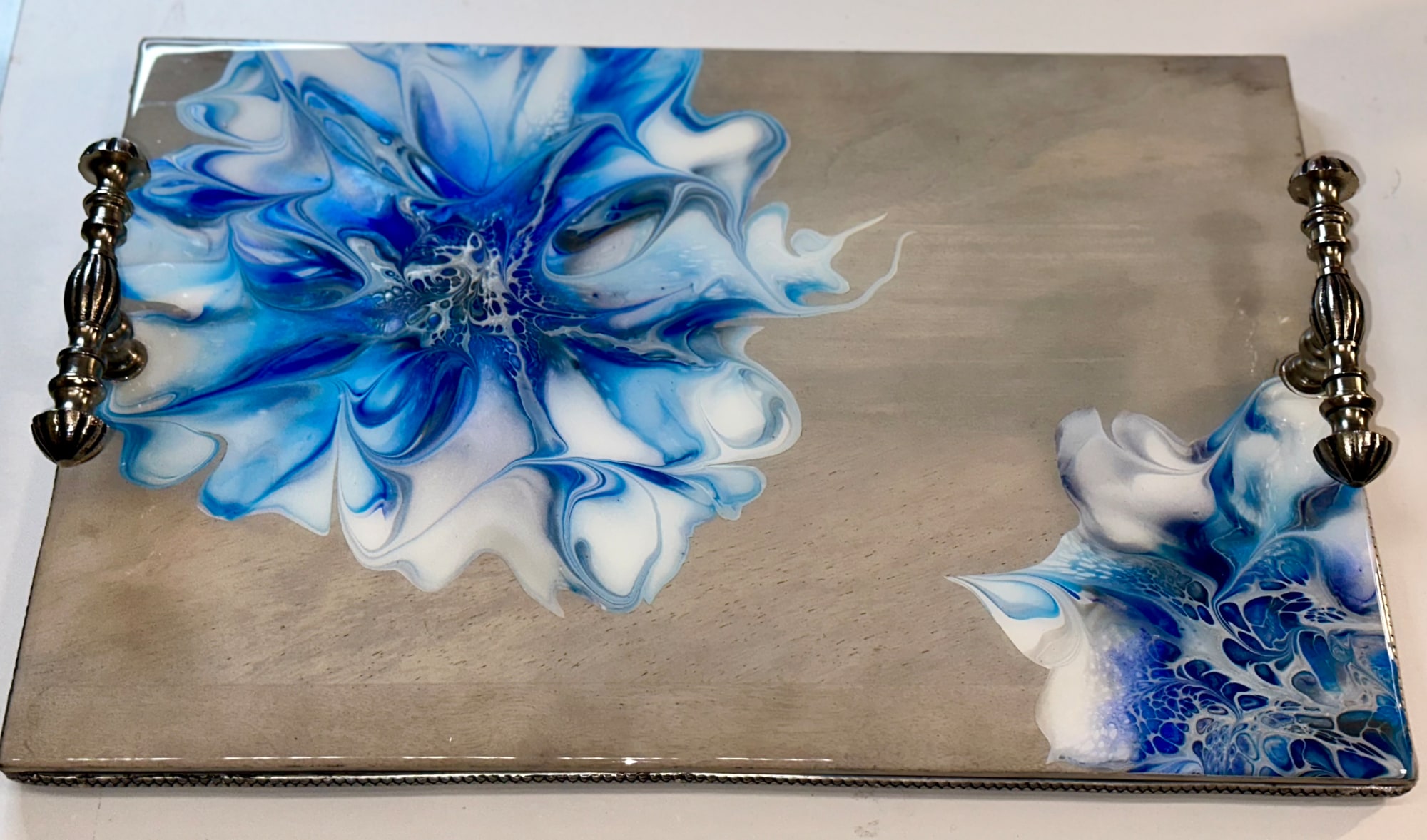 Acrylic Paint, mica pigments, and resin on acacia wood platter with metal handles.