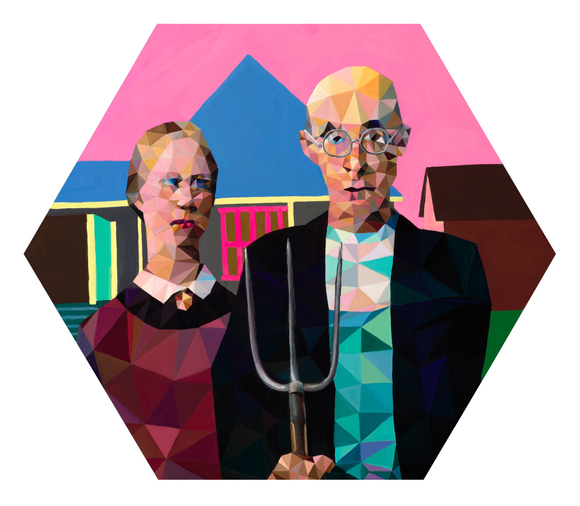 My interest in appropriation like most artists is to translate the work through a modern lens and through my own visual language. The remix of the original statement of Grant Wood's piece into neon colors and simplification of form concentrates the message into a new interpretation. Only the pitchfork is painted in a realistic fashion, the rest is imagined through the polygonal topology. This piece vibrates in three dimensions using anaglyph glasses.