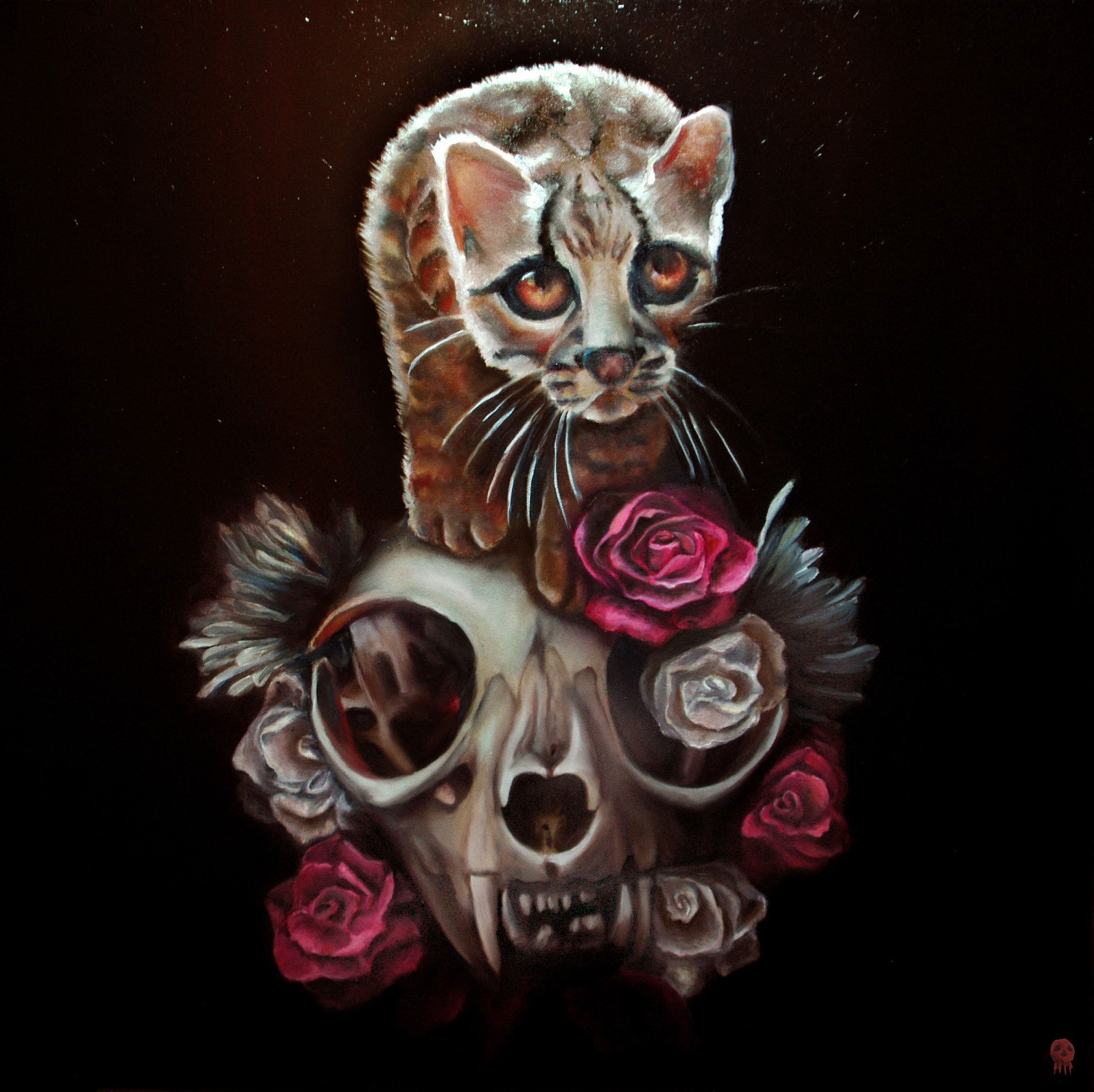 I painted the Margay in the 17th century style of the memento mori Dutch artists as an homage to it's struggle to exist in a world every changing and influenced by humanity and as a reminder of mortality.