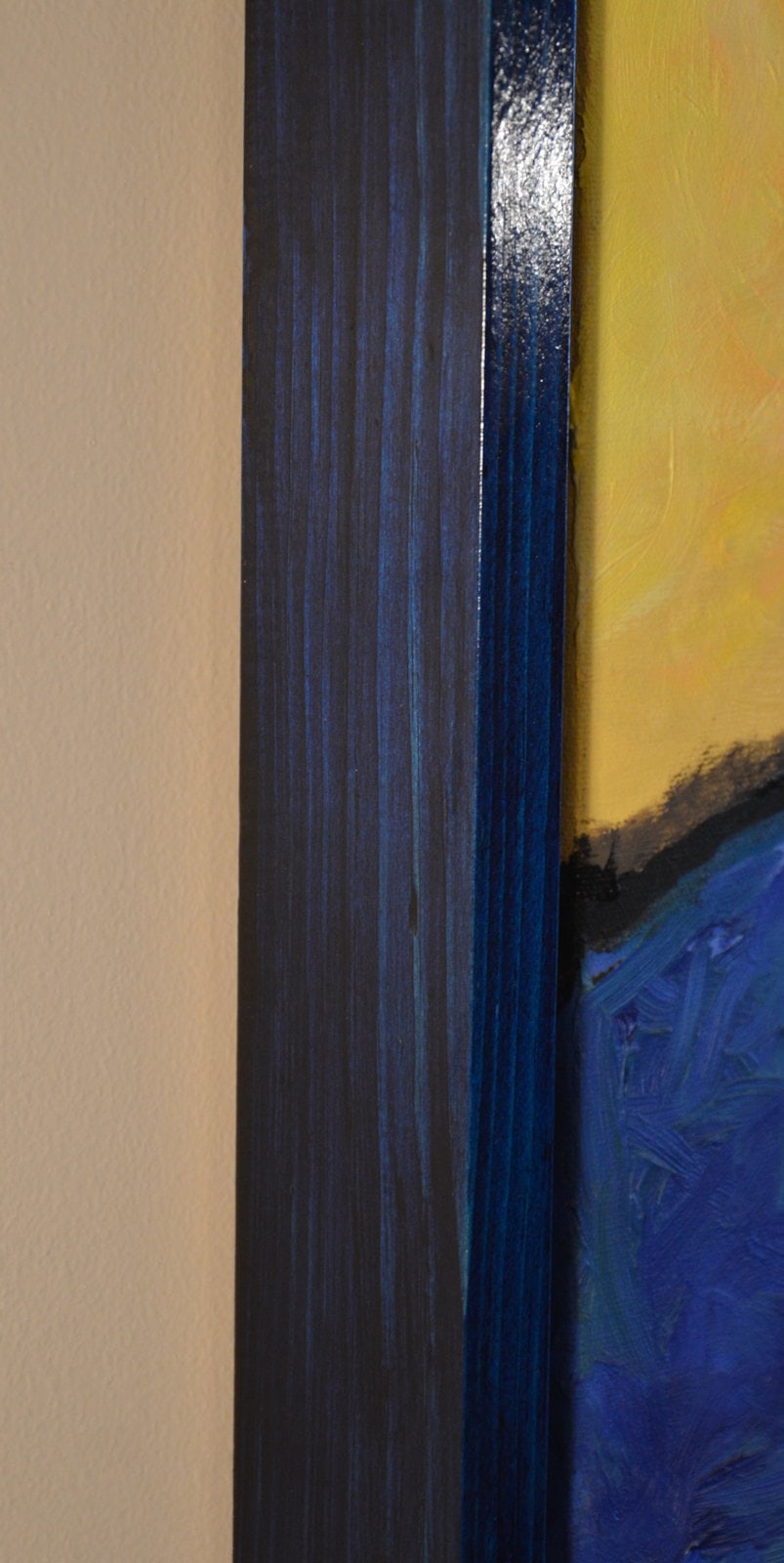 Whimsical nautical themed painting of imaginary coastal port. Diptych painting; 2 panels 60-30 inches. Custom wood frame with Prussian blue finish.