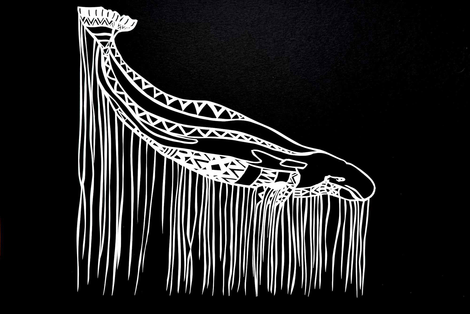 This papercut depicts a beluga whale and was created in Winnipeg, Canada.