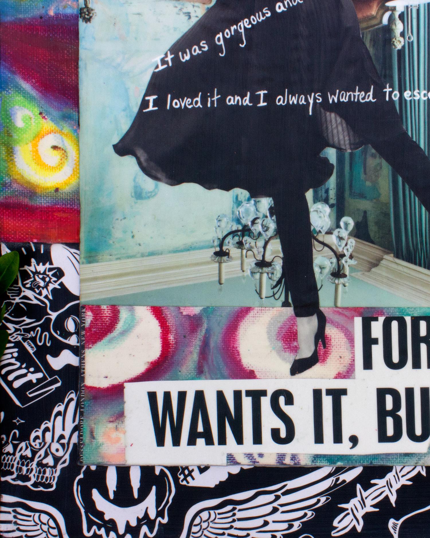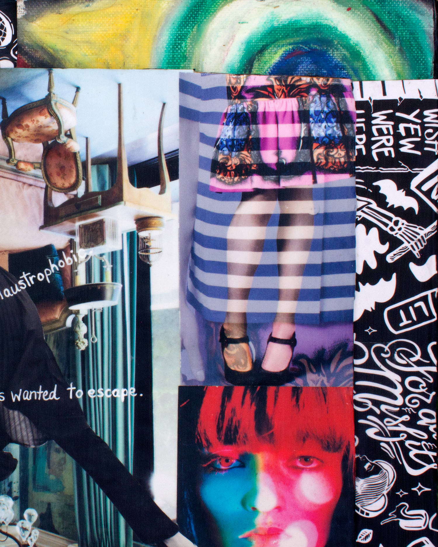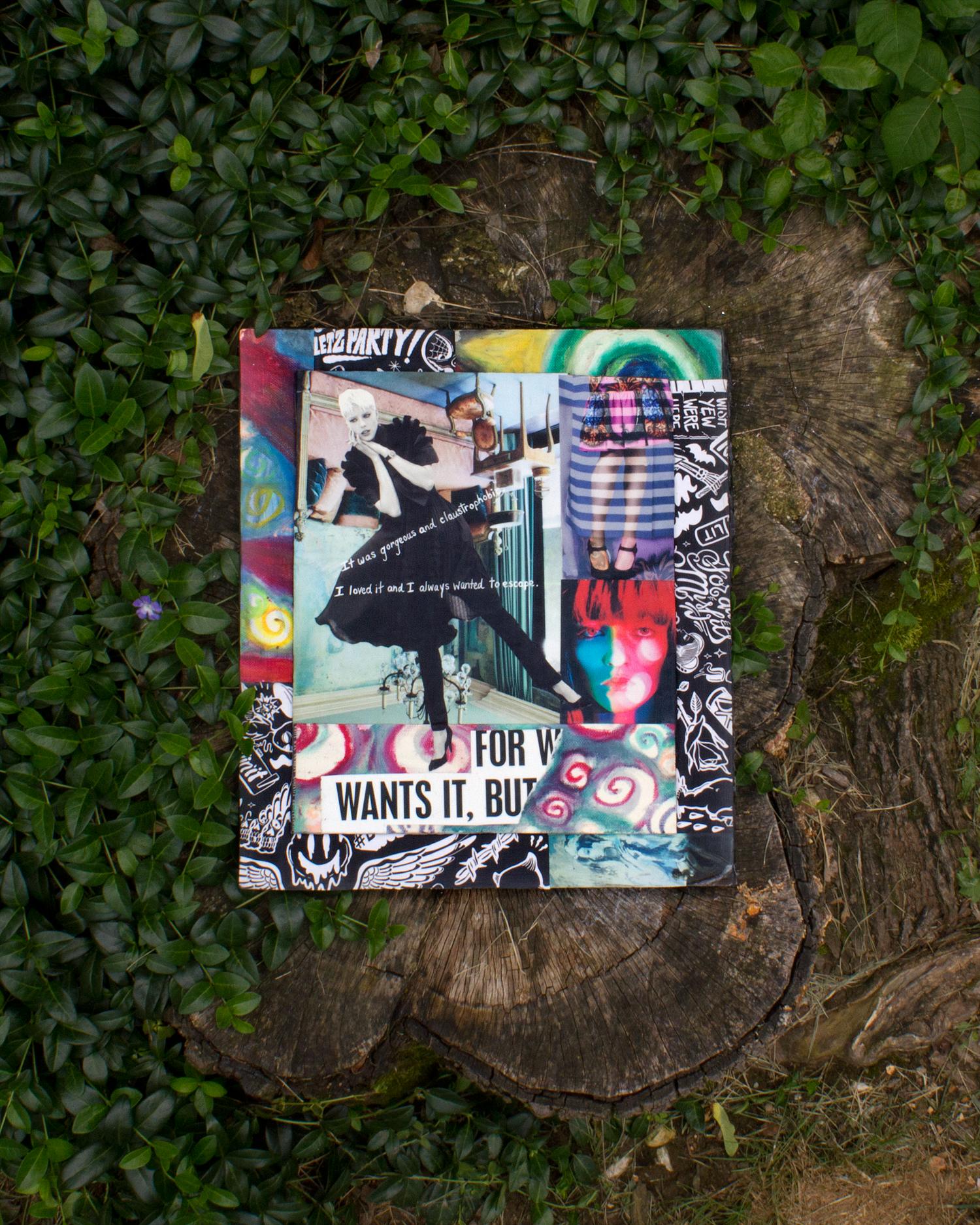 Paper, oil pastel, packaging tape and gel ink on cardboard