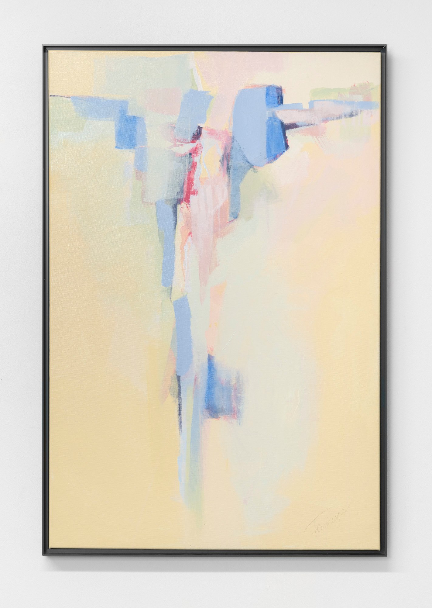 Pastel palette with broad ground of lime sherbert green. two blue blocks face each other in the central composition. Used blues to create depth. Started with a red/dark blue composition which continues to peek through. Painted in tandem with two other similar pieces. Reminds me of ice cream sherbert. Framed in a gunmetal aluminum float frame.