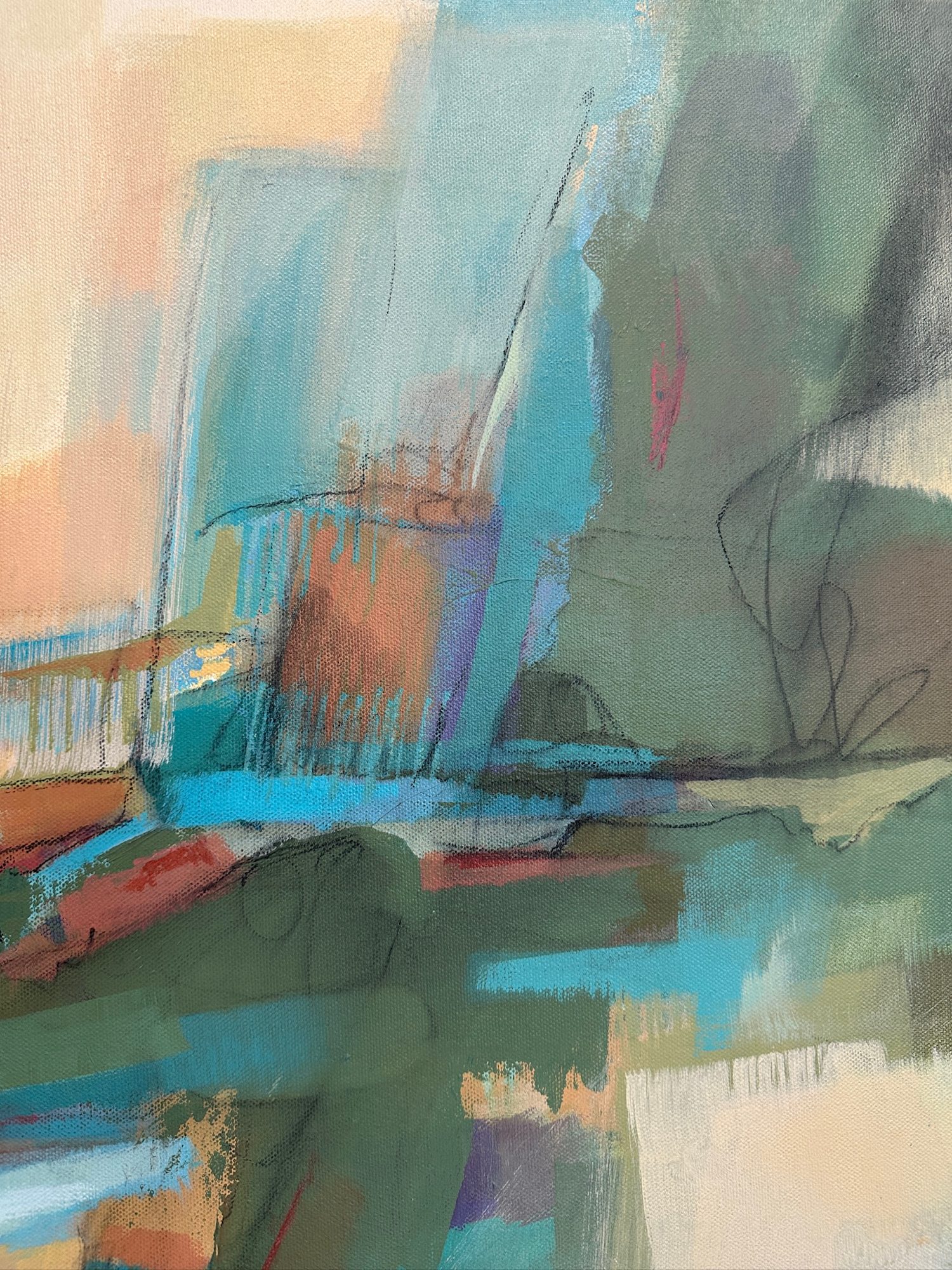 The artwork is an abstract painting dominated by soft, muted tones of beige and pale yellow, contrasted with vibrant streaks of turquoise, teal, and reddish-brown. The composition features an arrangement of geometric and organic shapes that intersect and overlap, creating a sense of depth and movement. Central vertical elements give the impression of a flowing form, possibly resembling a waterfall or a canyon, with the vivid blue hues drawing the eye downward. The edges of the shapes blur into one another, blending the colors harmoniously, while some lines and patches of paint introduce texture and structure to the piece. The overall effect conveys a dynamic yet serene landscape rendered through abstract expressionism.
