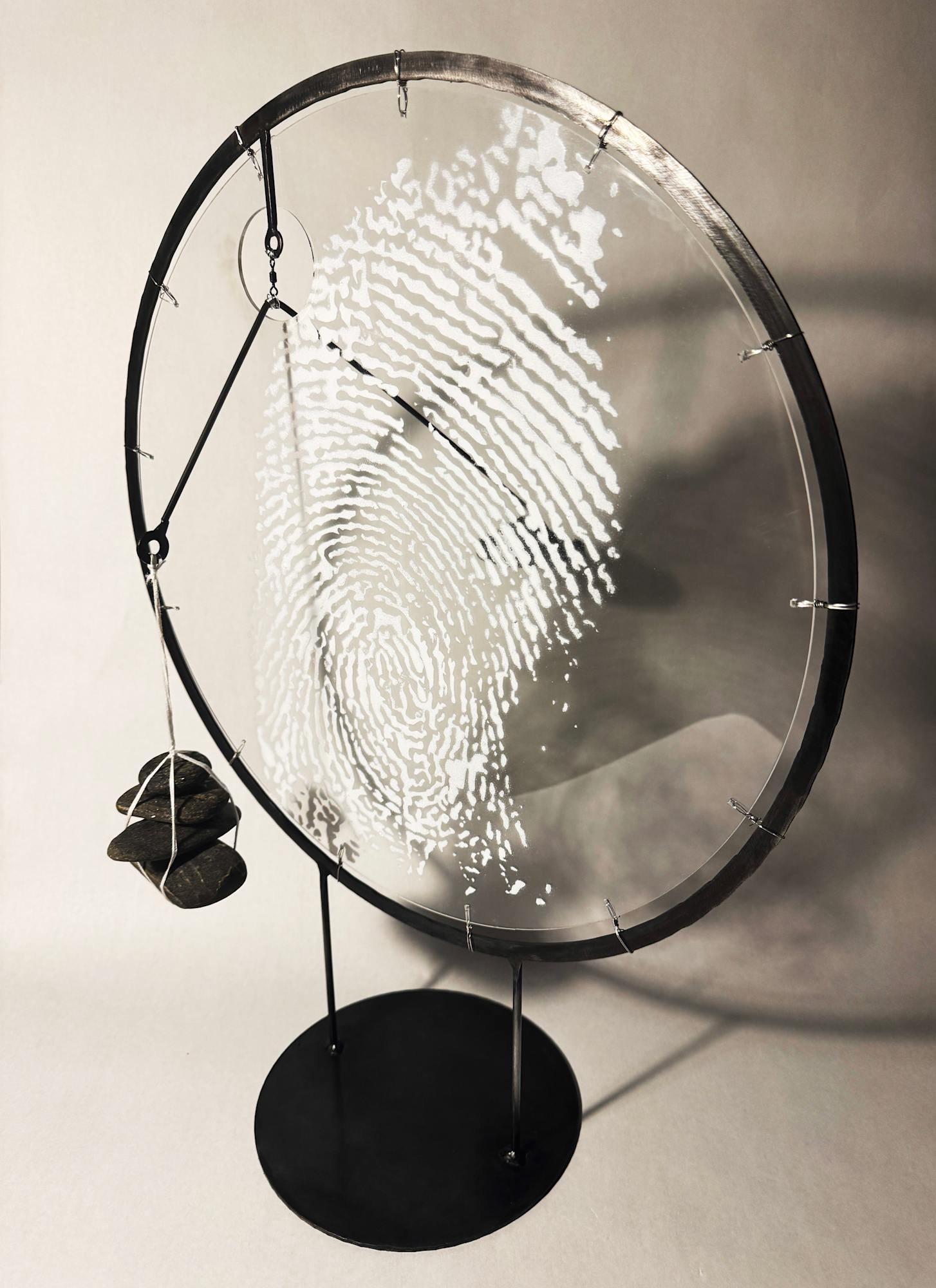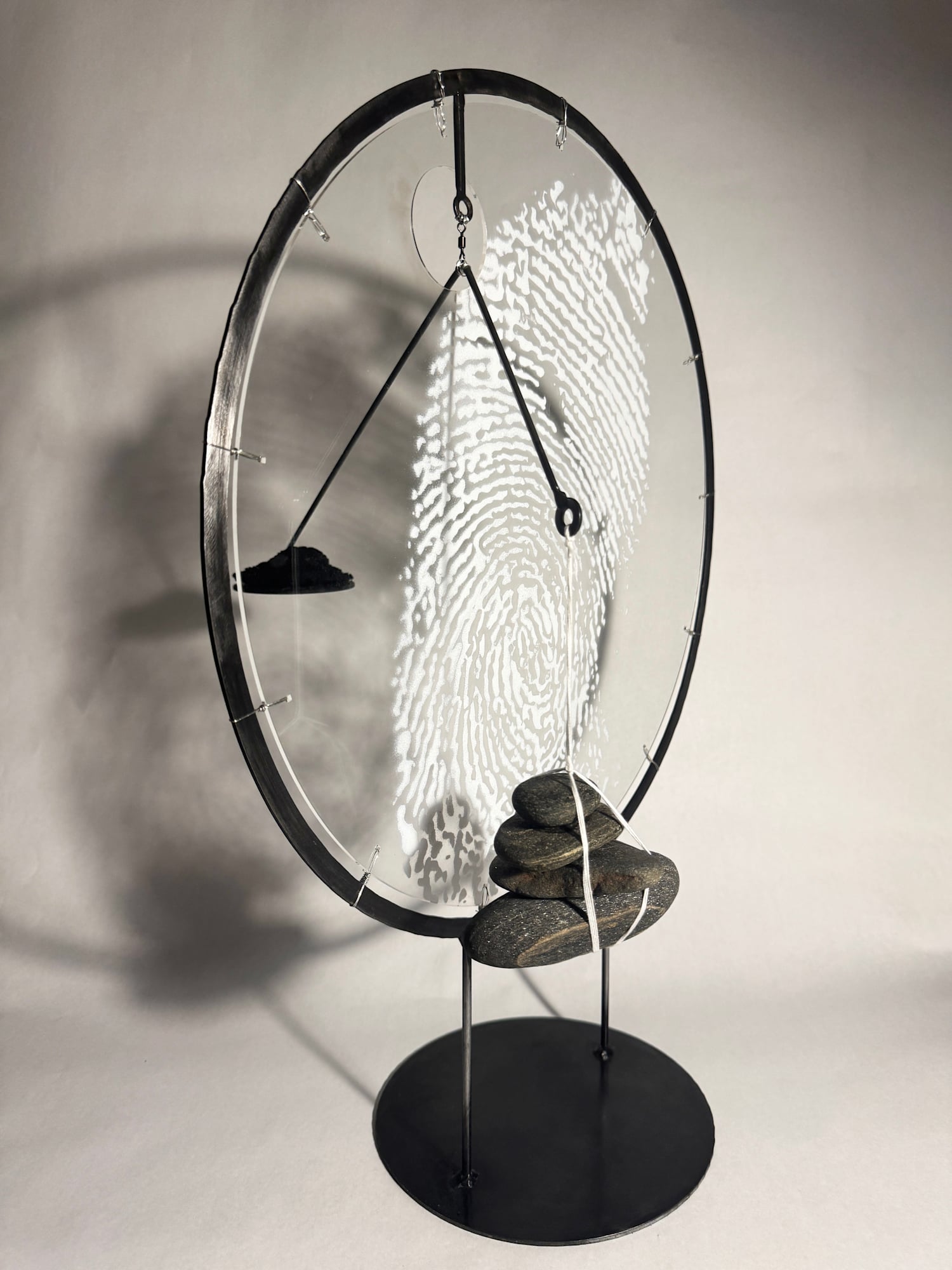 Steel with black patina, cast acrylic, spray paint, rocks, sand