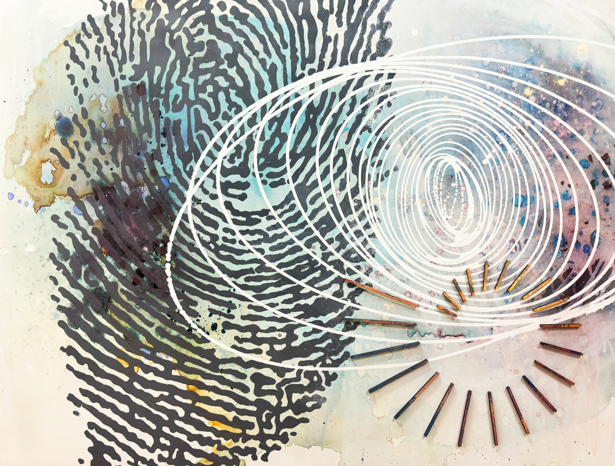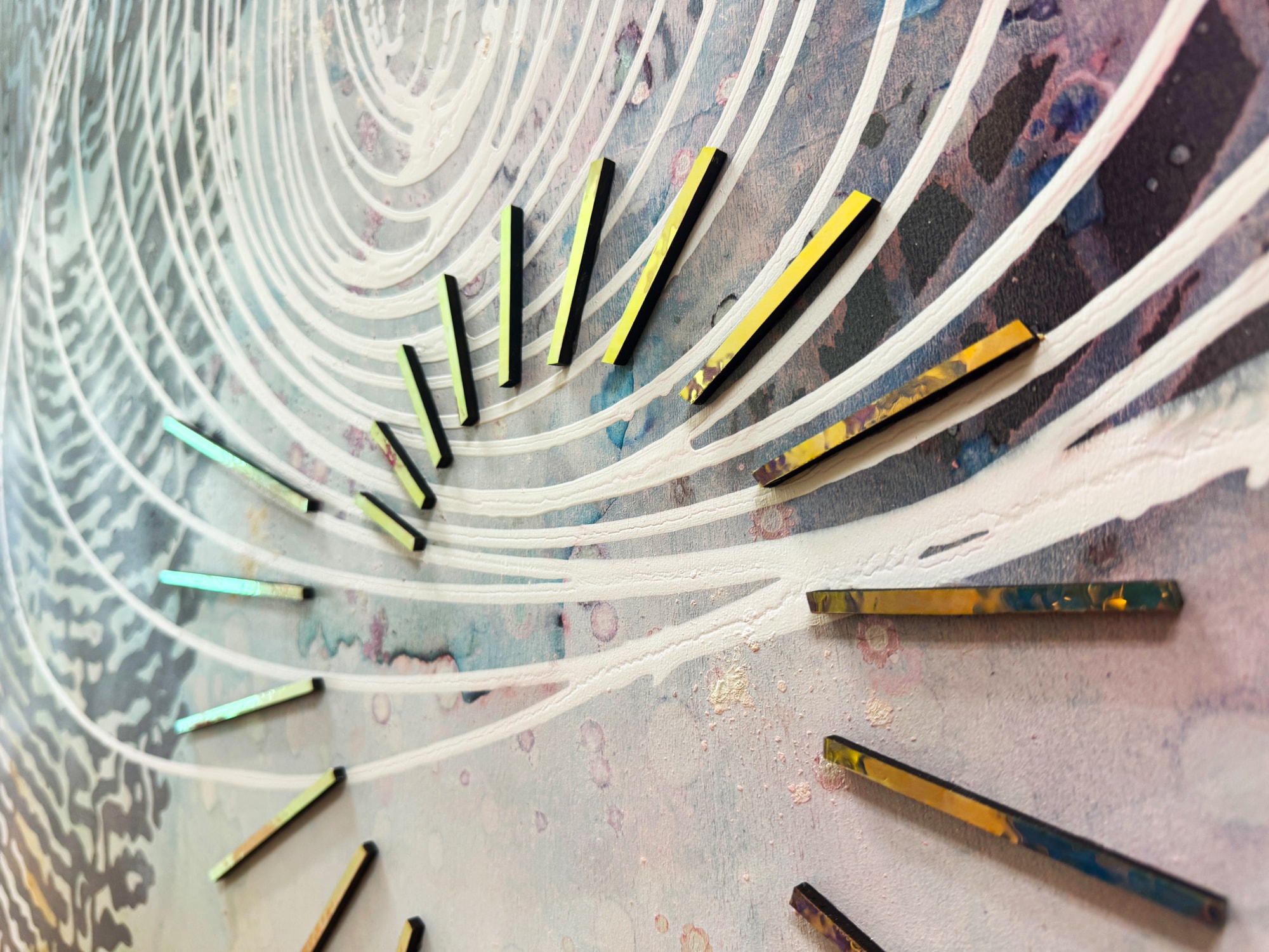 Ink, acrylic paint, laser cut wood, holographic film, holographic pigment, latex paint