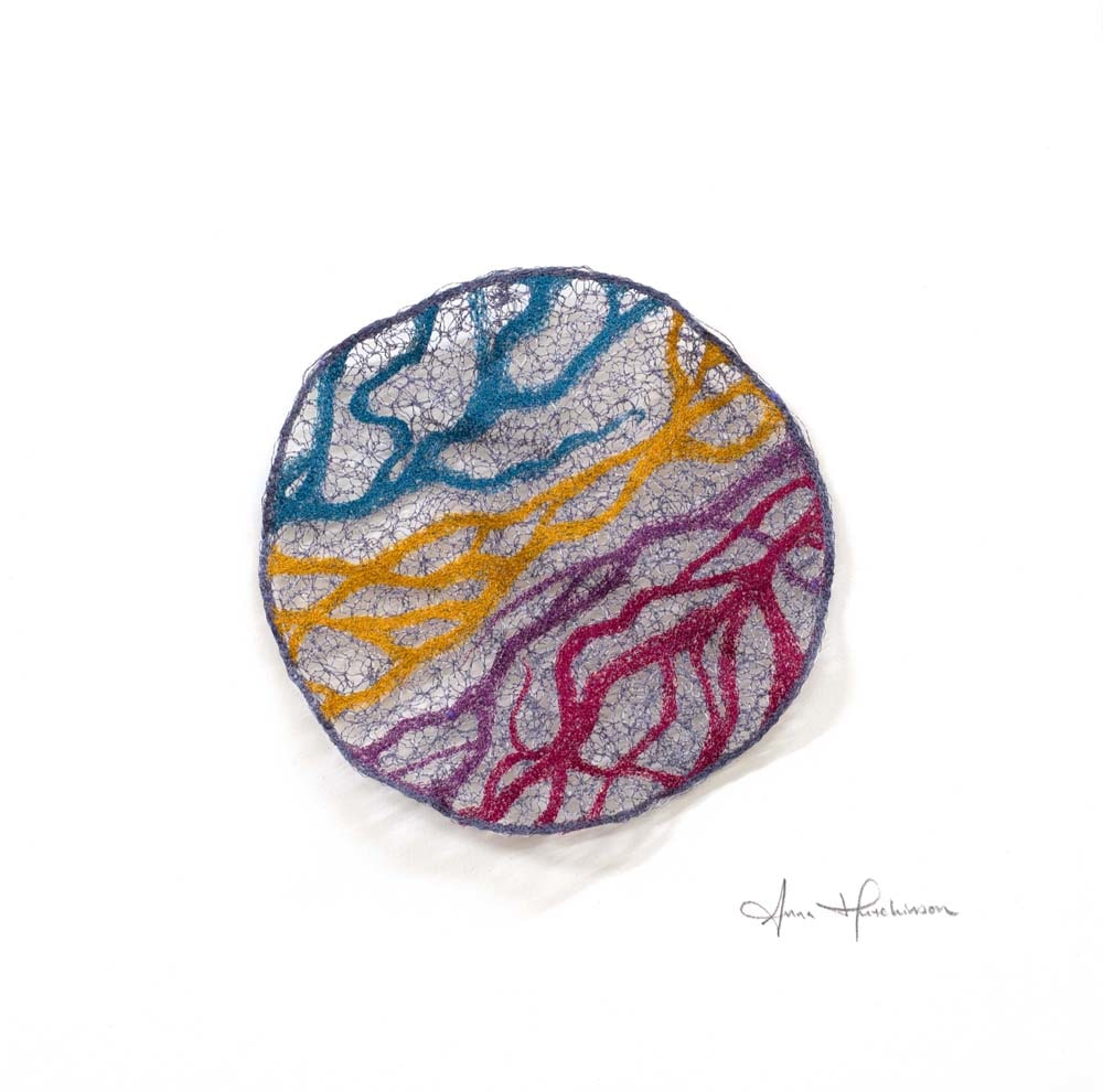 Skyscape 5 offers an abstracted, inverted perspective on sunset; where the deep blue base represents the Atlantic Ocean and the sky reflected beneath is layered in radiant golds, purples, and crimson. The stitched lines flow like reflections, giving the impression that the viewer is looking both at the sky and into the water. This duality plays with perception, suggesting the way sunset colours ripple across the sea as much as they paint the sky. A piece that blurs boundary and direction, it captures the interconnectedness of ocean and atmosphere at day’s end.