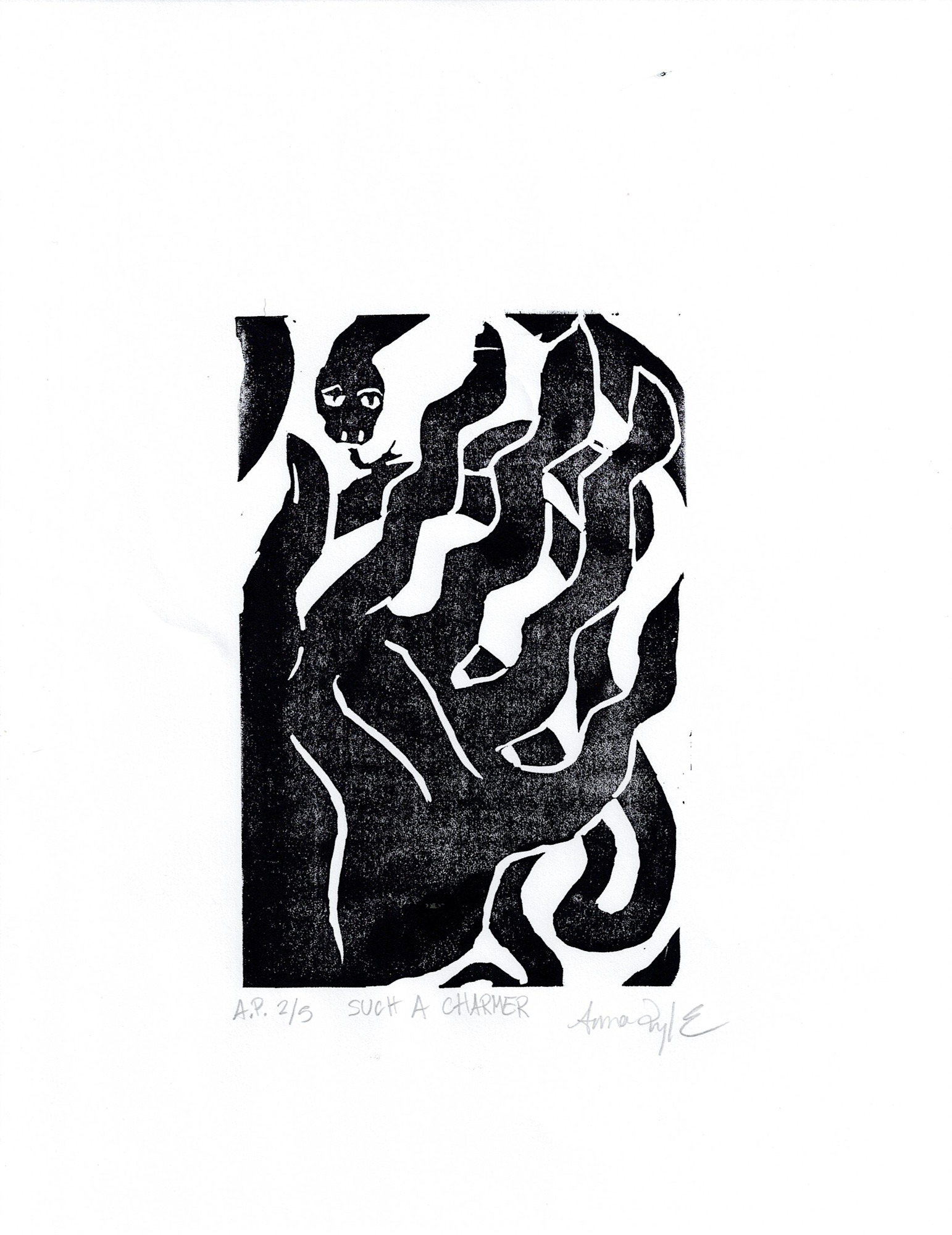 This set of block prints are created using a linocut carving and print pulling process depicting a hand resembling a snake and a snake resembling the hand. Each print in this series is entirely unique and handmade.