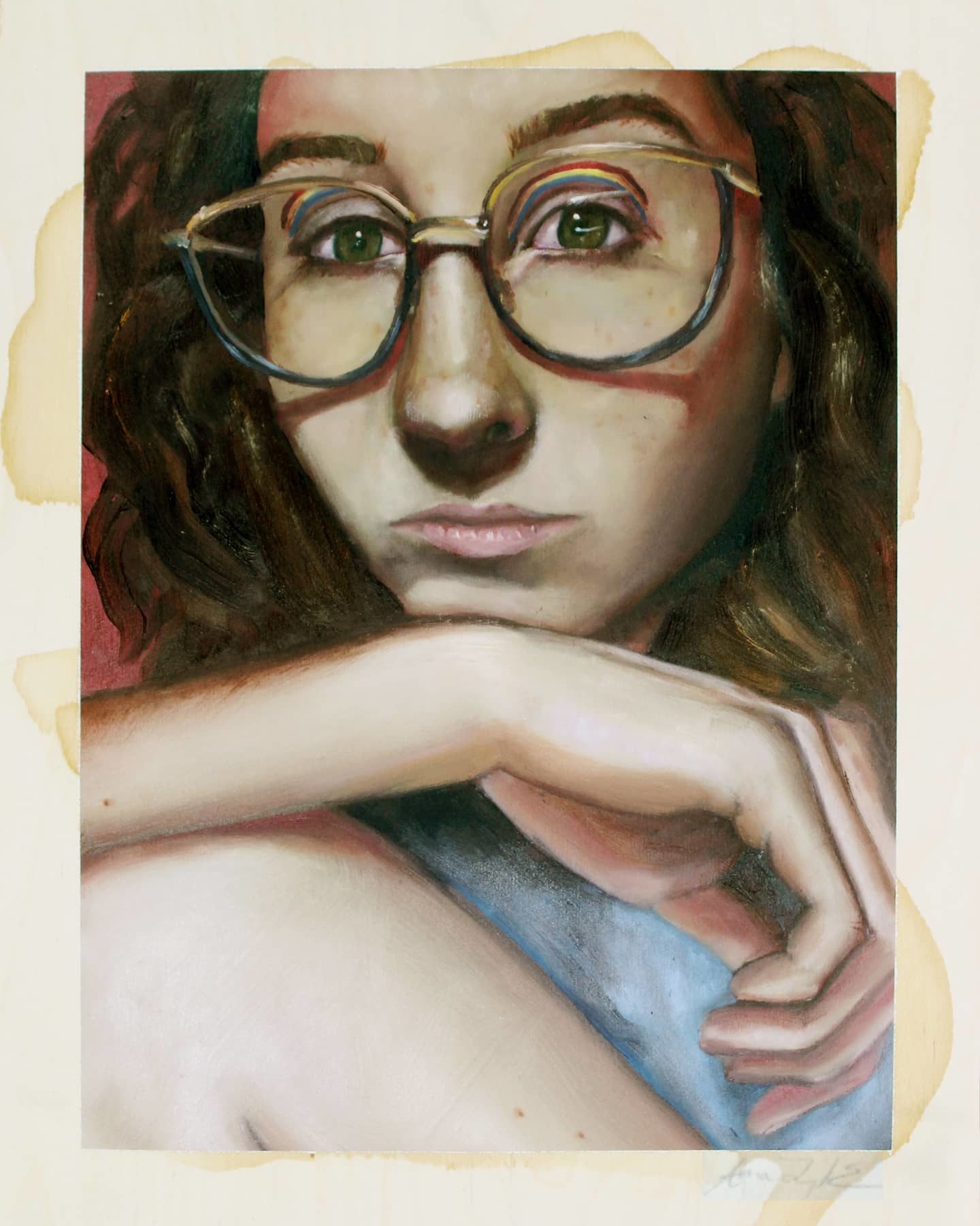 'Sunday's Portrait' is a self portrait that acts as a sequel to 'Sunday's Best'. I use the same motif I made in 'Sunday's Best': painted rainbows on the eyelids. The reason I created a secondary look at this concept was to show that the same issues we hold as children are carried on into our adulthood. I purposefully designed this painting using my own face and body to put myself and my in a more vulnerable light.