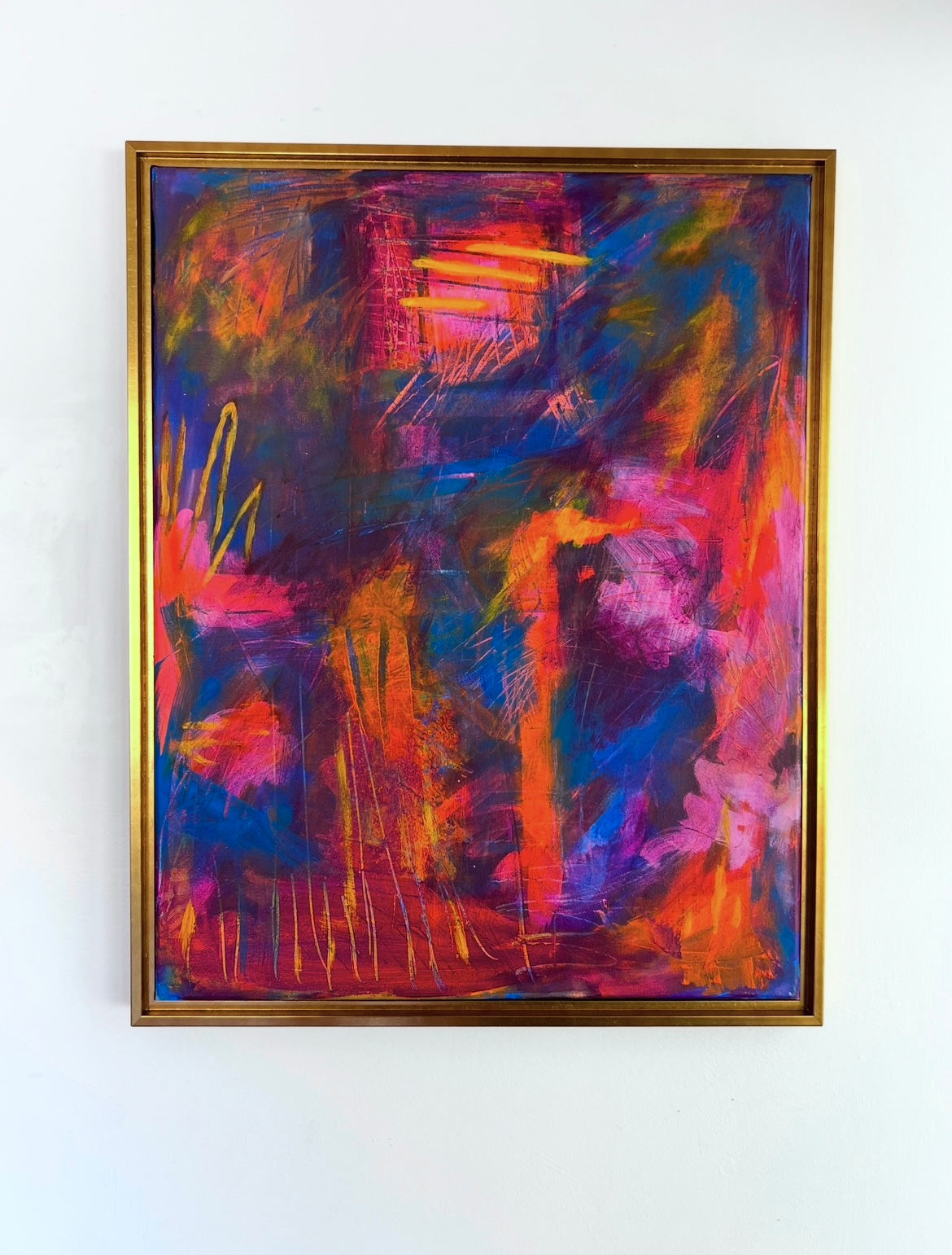 This abstract painting plays on the idea of light, layers, and transparency. I have a fascination with how light can change an environment and the way different shades of light effect each other. I used a variety of bright and neon colors to create a piece of art that mimics artificial light.