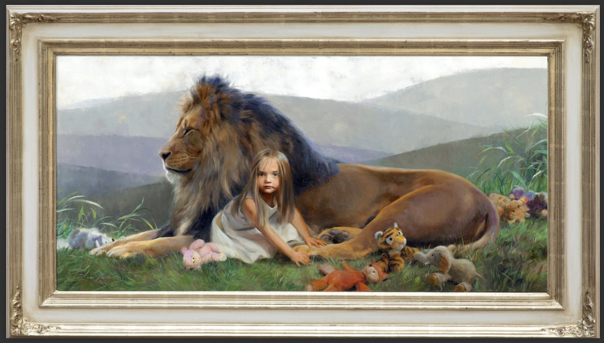 When I began this painting my objective was to create a "lion and lamb" themed artwork that had never been done in quite this way before. Originally it was just the little girl and the lion, but it evolved into so much more as I added in stuffed animals along with the wild, jungle-like surroundings. One could interpret this piece in many different ways. On the surface it appears to be a contemporary interpretation of the passage from Isaiah 11, but on another level, it becomes more about the challenges that a young child faces as she transitions into adulthood. The model is my daughter, five years old at the time. Her intensity has always struck me and I know she will be a world-changer. Here, she faces the viewer undaunted, almost daring us to bring it on, and while the remnants of childhood lay cast aside, she embraces the strength of the lion and looks ahead with courage rather than fear.