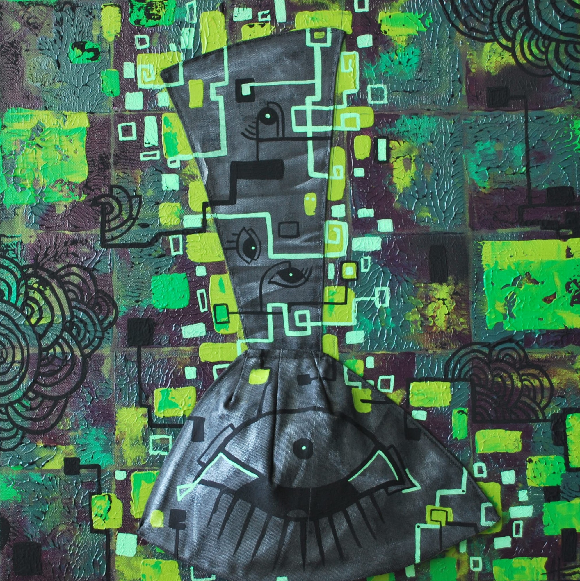 Inspired by Rick Owens' iconic Black Boots, my piece delves into the emotional depth of the designer's journey, resonating with the experience of feeling 'different' and finding beauty in the unconventional. Through a palette of purples and dark greens reminiscent of Owen's early designs, juxtaposed with dyed military fabrics in black, I pay homage to his aesthetic while infusing my personal narrative. The striking red hues beneath the boots' caps symbolize the unveiling of vulnerability, inviting viewers to explore the layers of emotion and identity beneath the surface.