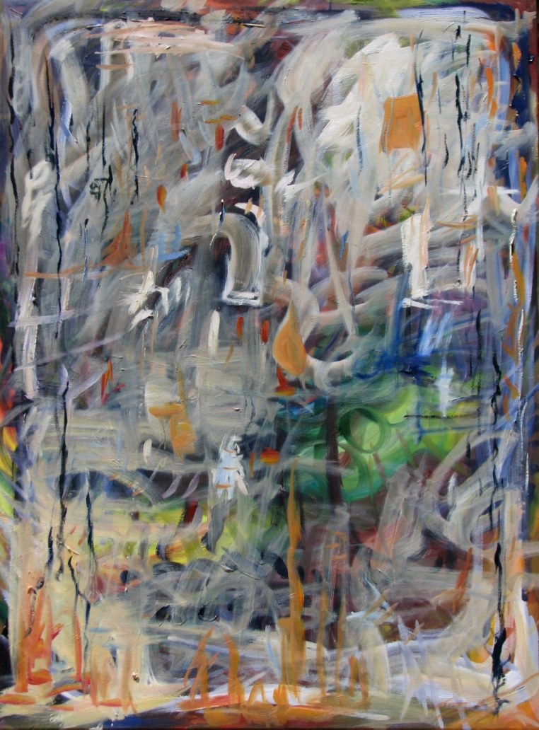 This masterpiece, created in one afternoon in 2011 in my upstairs bedroom-turned-studio. As with most of my best pieces, I didn't recognize how good it was until years later. I can't even explain the joy that was going thru my veins to my arms to my hands. It was like being overwhelmed by joy- spiritual. Obviously, there was no composition or picture in mind that I needed to create to resemble something. It was sheer connection with color. The background started out dark (indigo, ultramarine, etc.) and as was my custom early in my painting career, I gleefully and haphazardly chose colors to add to the background, mixing them directly on to the canvas rather than painstakingly mixing on a palette to get "just the right" color before adding to the canvas. Its more fun that way. See what happens. Turns out, the mixing is not so haphazard after all. I chose these colors for a reason. They mean something. They make me feel a certain way. They express something that I am feeling at the time. Whether that same feeling conveys to the viewer is not the objective. The viewer will take their own impression, as it should be.