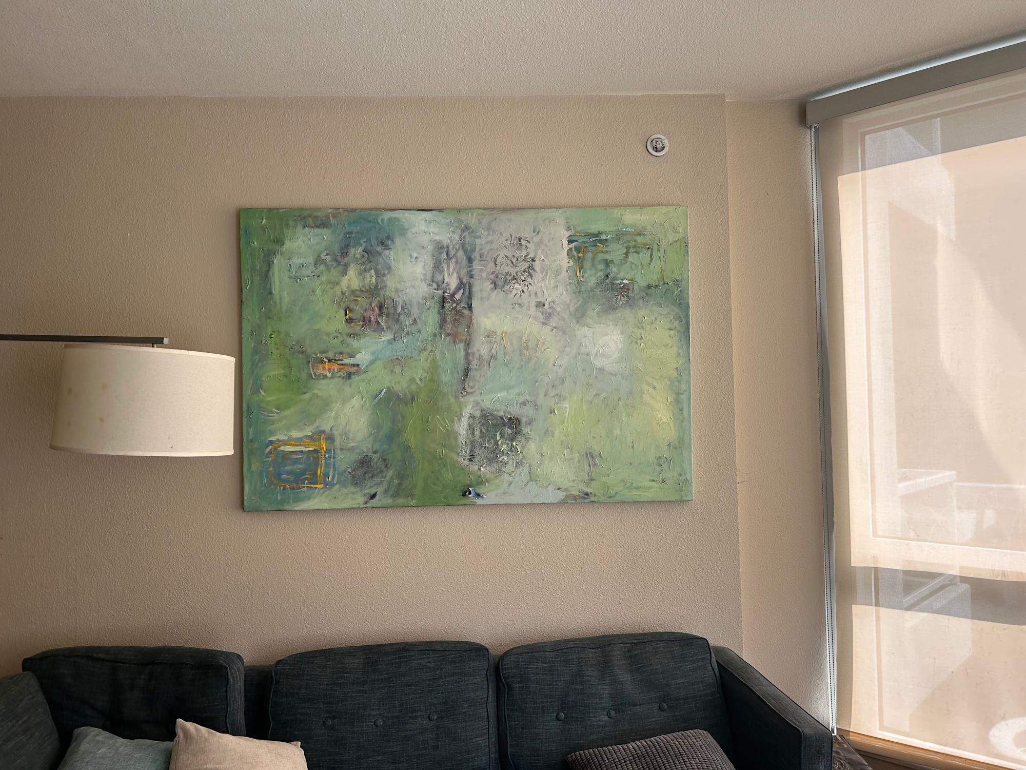 Begun in 2008, completed in 2020, this piece was reworked and retitled from the original (2010): "The City" (as originally envisioned) an abstract cityscape of New York. Reworked it until it no longer looked anything like a cityscape. There remains a patch of blue sky and shadow-y non-descript buildings barely visible. This city has been over-run by green grass and trees (sort of the opposite of Joni Mitchell's "Paved Paradise"). New title: "This Used to be the City (Now it's Green)." The multiple layers give this piece a texture and 3 dimensional surface . The composition was later transferred to fabric/paper and re-imagined as a sculpted CoLorFIeld "painting." Please see: 3D piece titled "The Physicality of Light" (inventory # 2023-11)