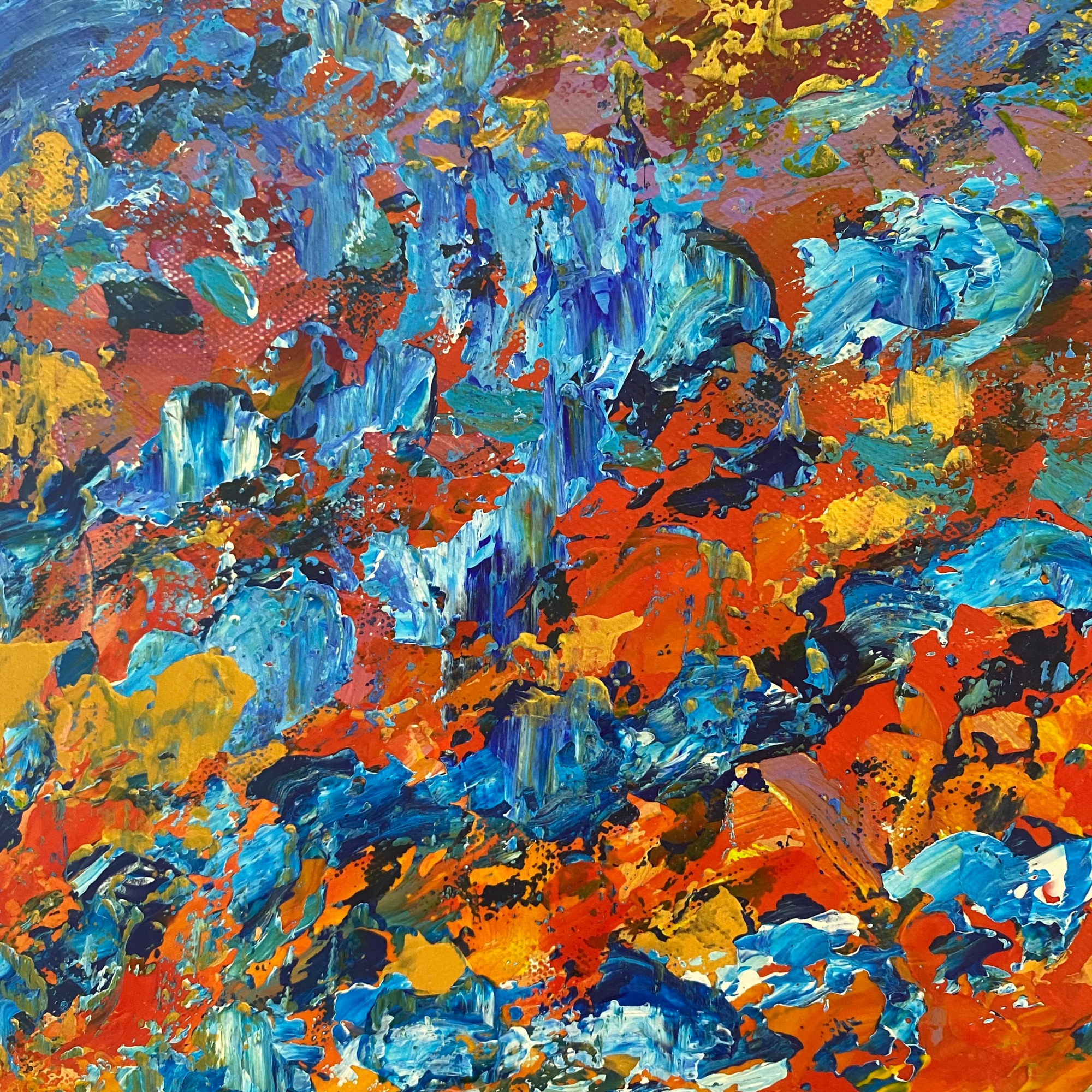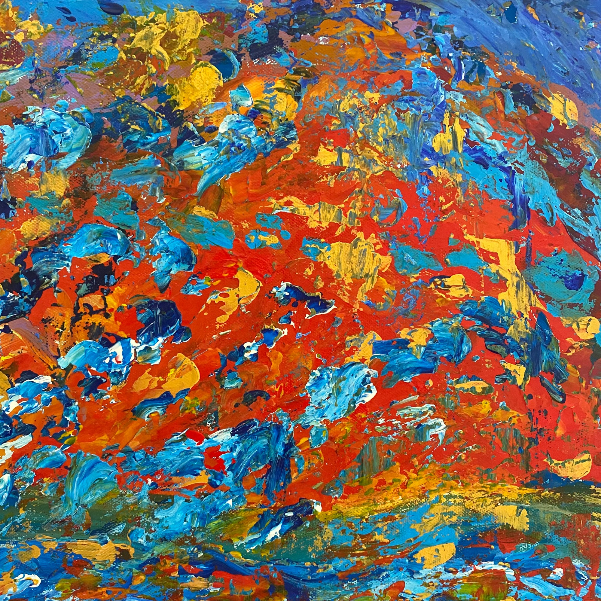 The painting depicted in the image is a vibrant Red Sea and dynamic abstract artwork. It is a fascinating composition that showcases a wide array of bright colors and bold brushstrokes. The upper portion of the canvas is dominated by fiery shades of red, orange, and yellow, evoking a sense of a burning sky or a vibrant sunset. These warm hues create a powerful and energetic effect.