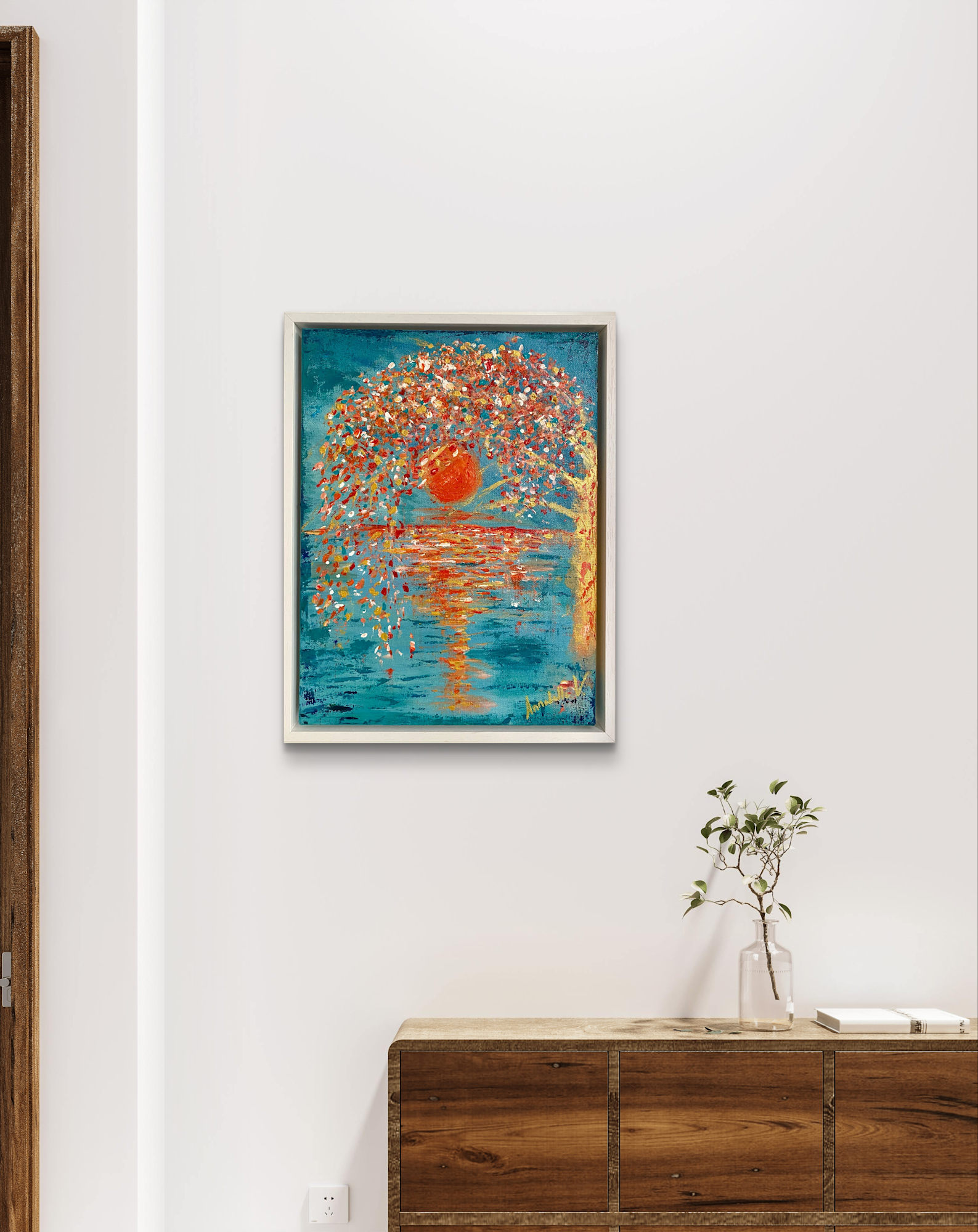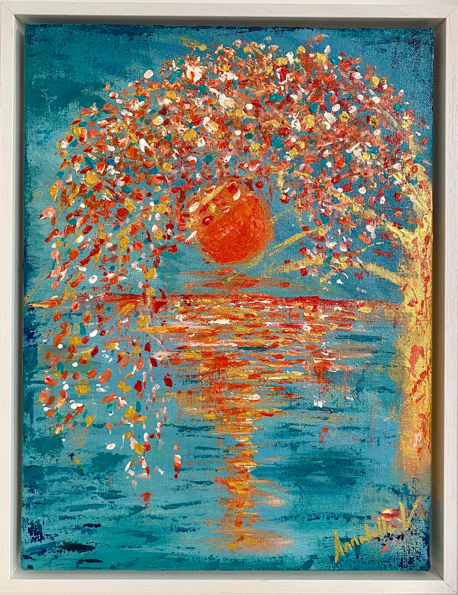 Beneath the gentle gaze of a coral moon, a tree leans into the night, its blossoms aglow with the promise of transformation. Each petal, kissed by the sun’s last golden rays, drifts softly into the water below—carrying wishes, memories, and the quiet magic of new beginnings.
