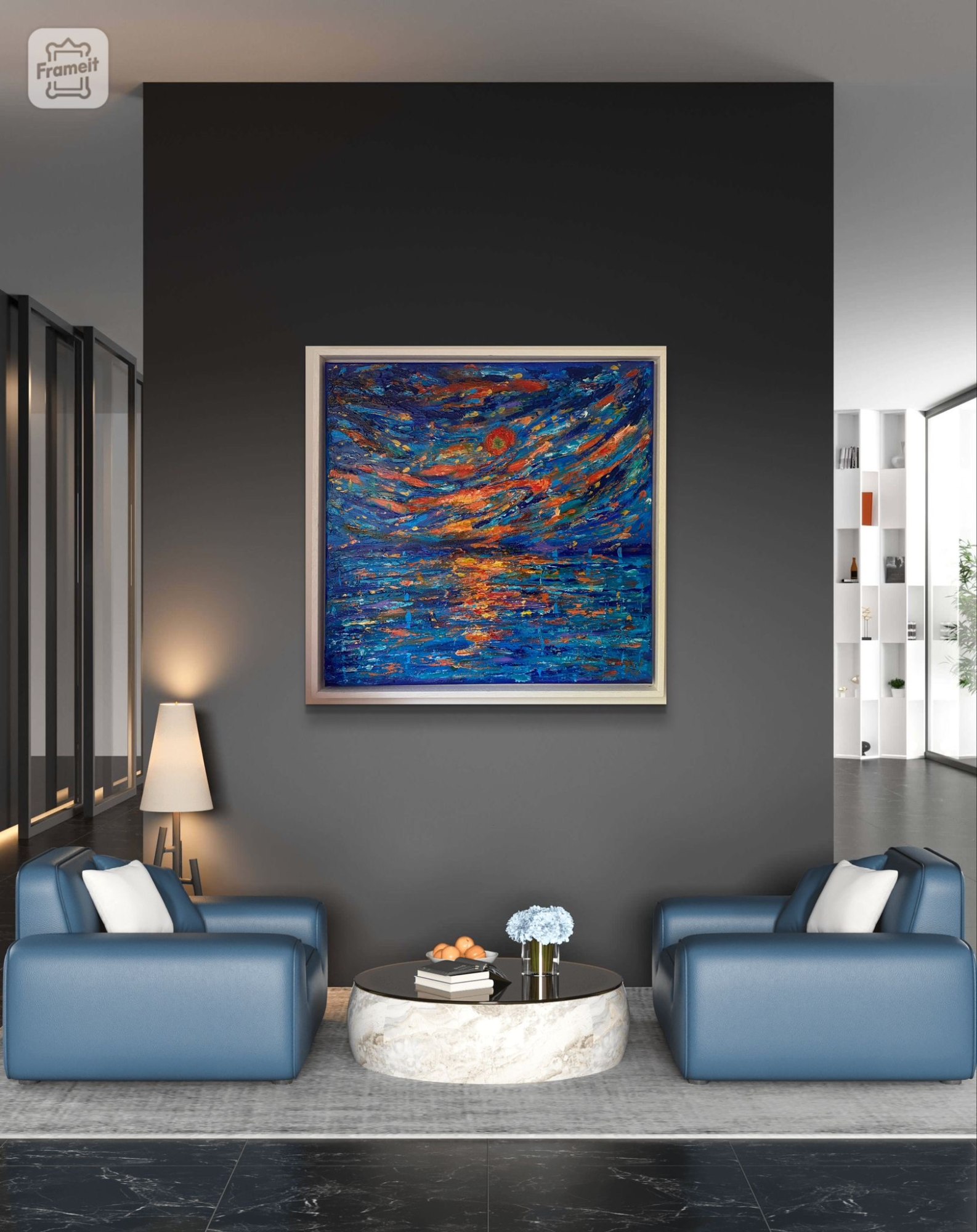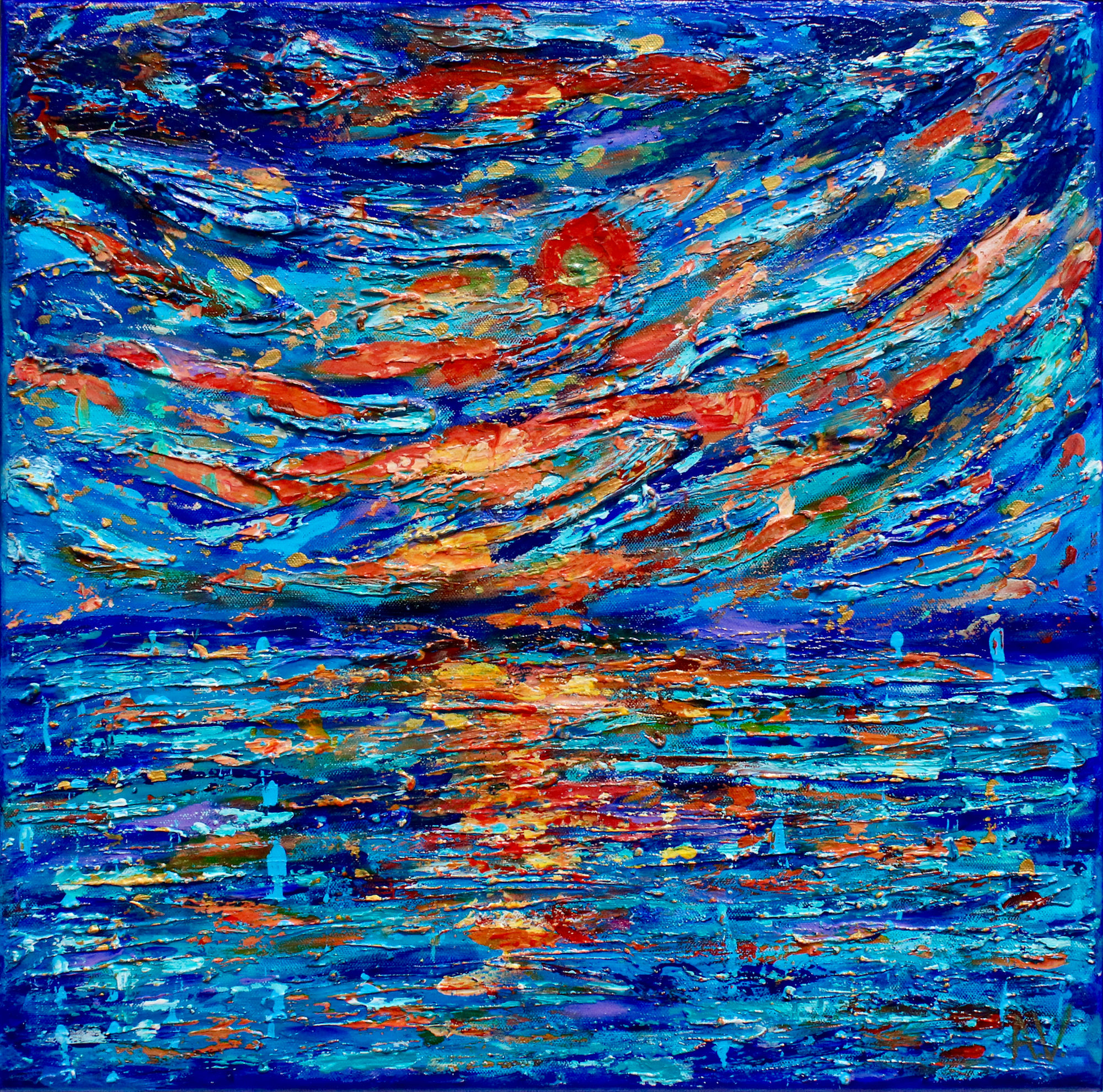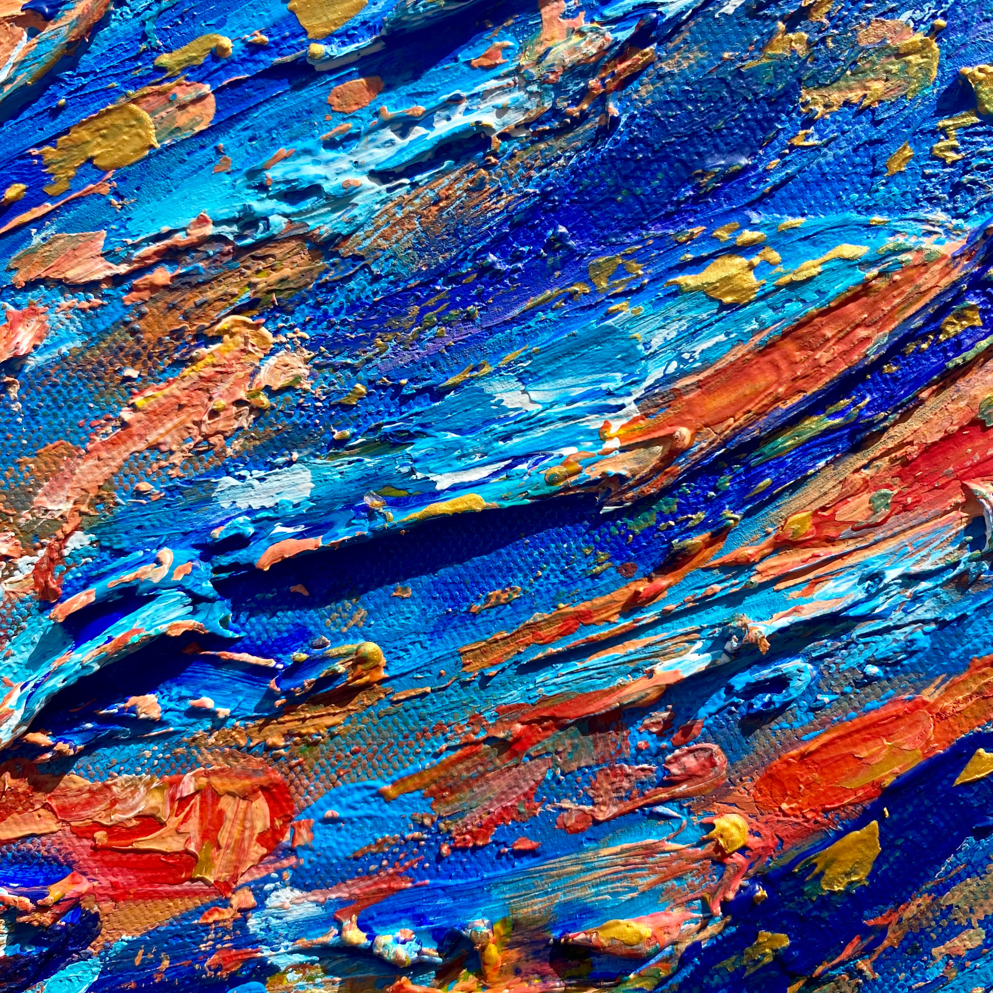 The painting, titled "Blue Symphony," merges the sea and sky into an harmonious symphony. The thick texture of the paint conveys movement, energy, and offers a tactile. The orange, yellow, and golden hues symbolise following one's heart's passion and shining brightly, while the indigo blue evokes the infinite possibilities of the night sky and ocean.