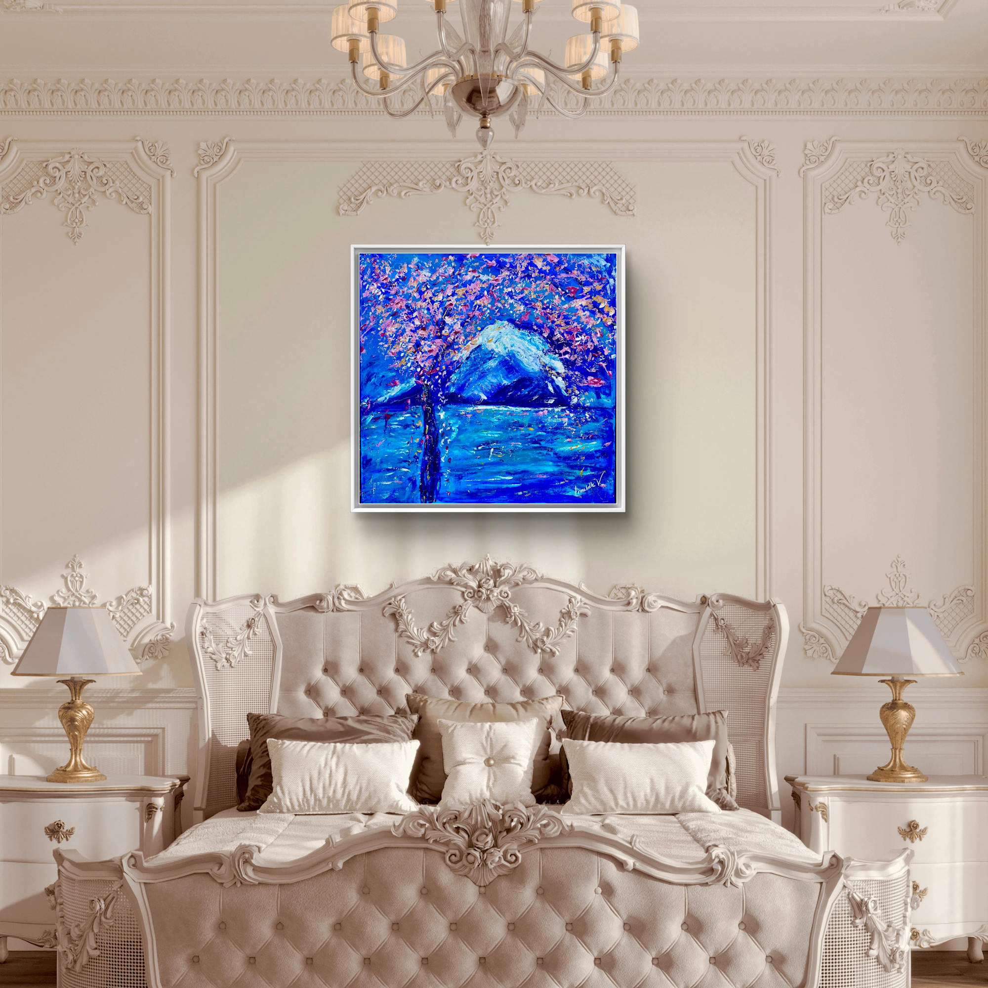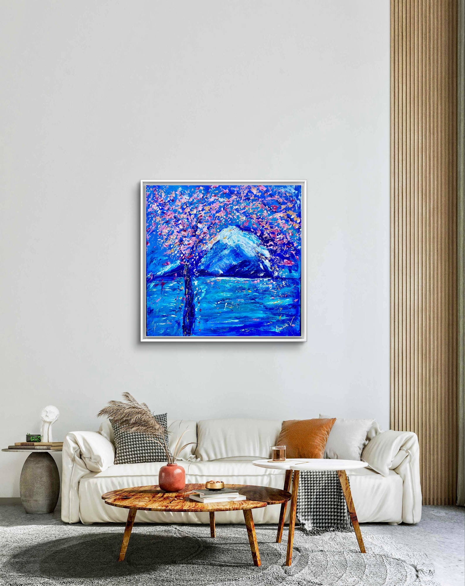 These delicate pink blossoms dancing across the brilliant azure sky capture that feeling of new beginnings and infinite possibilities bursting with joy and life. The serene blue waters below mirror this celebration, creating a dialogue between earth and sky—tranquility meeting pure joy.
