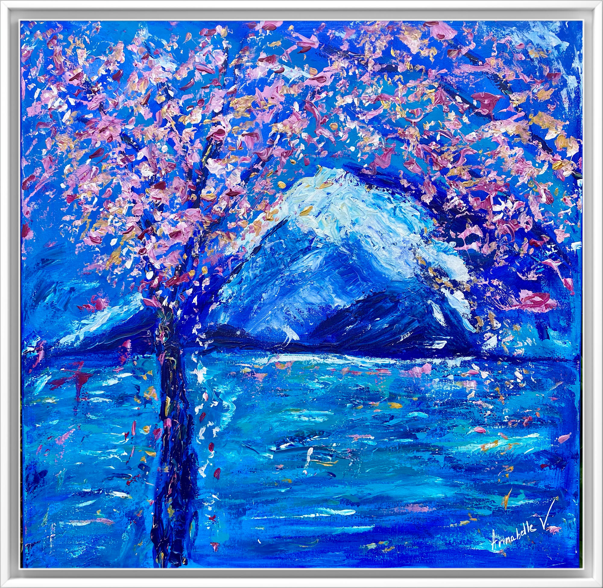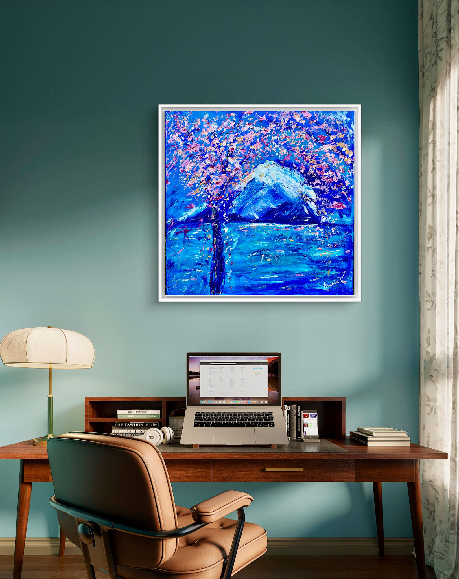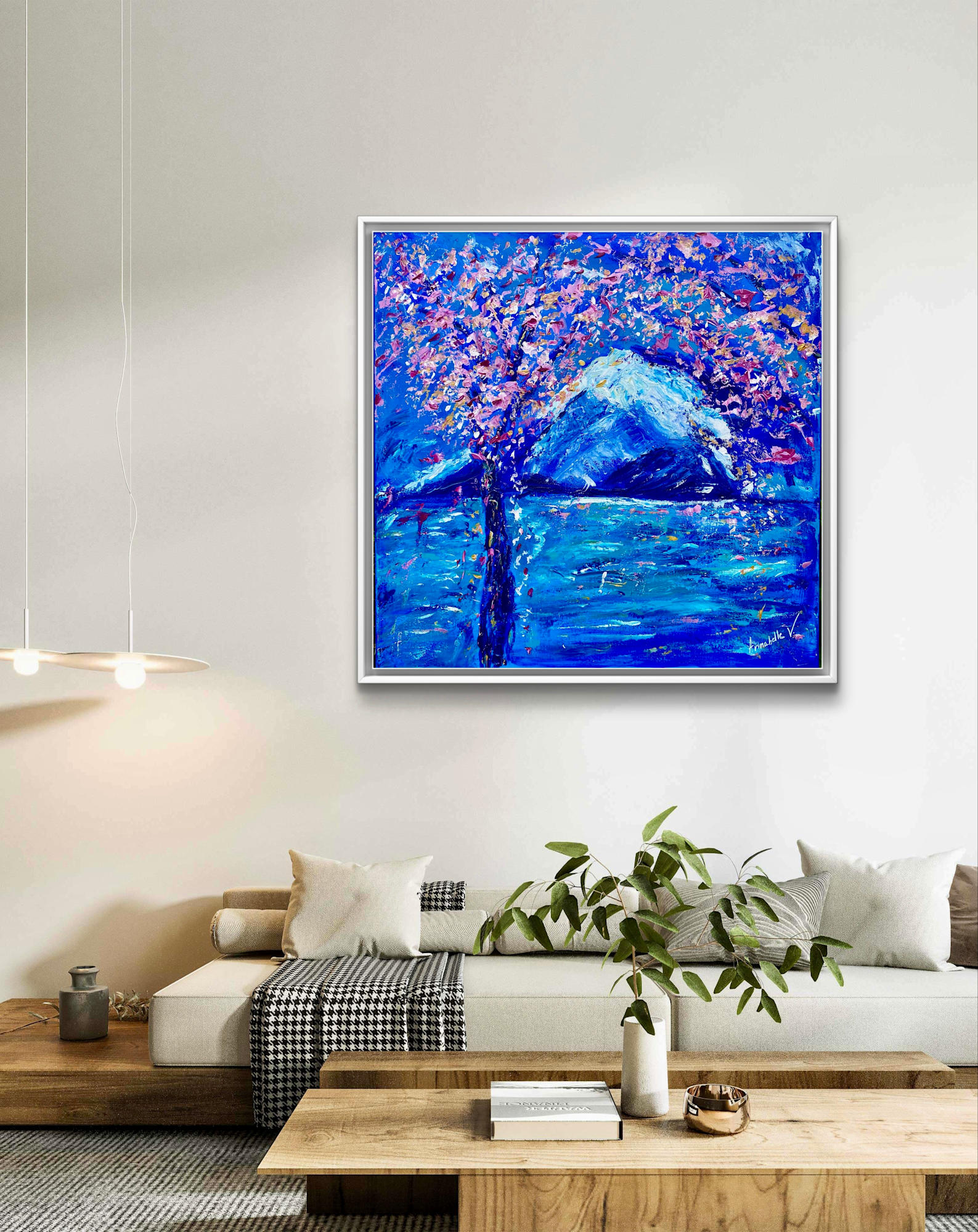 These delicate pink blossoms dancing across the brilliant azure sky capture that feeling of new beginnings and infinite possibilities bursting with joy and life. The serene blue waters below mirror this celebration, creating a dialogue between earth and sky—tranquility meeting pure joy.