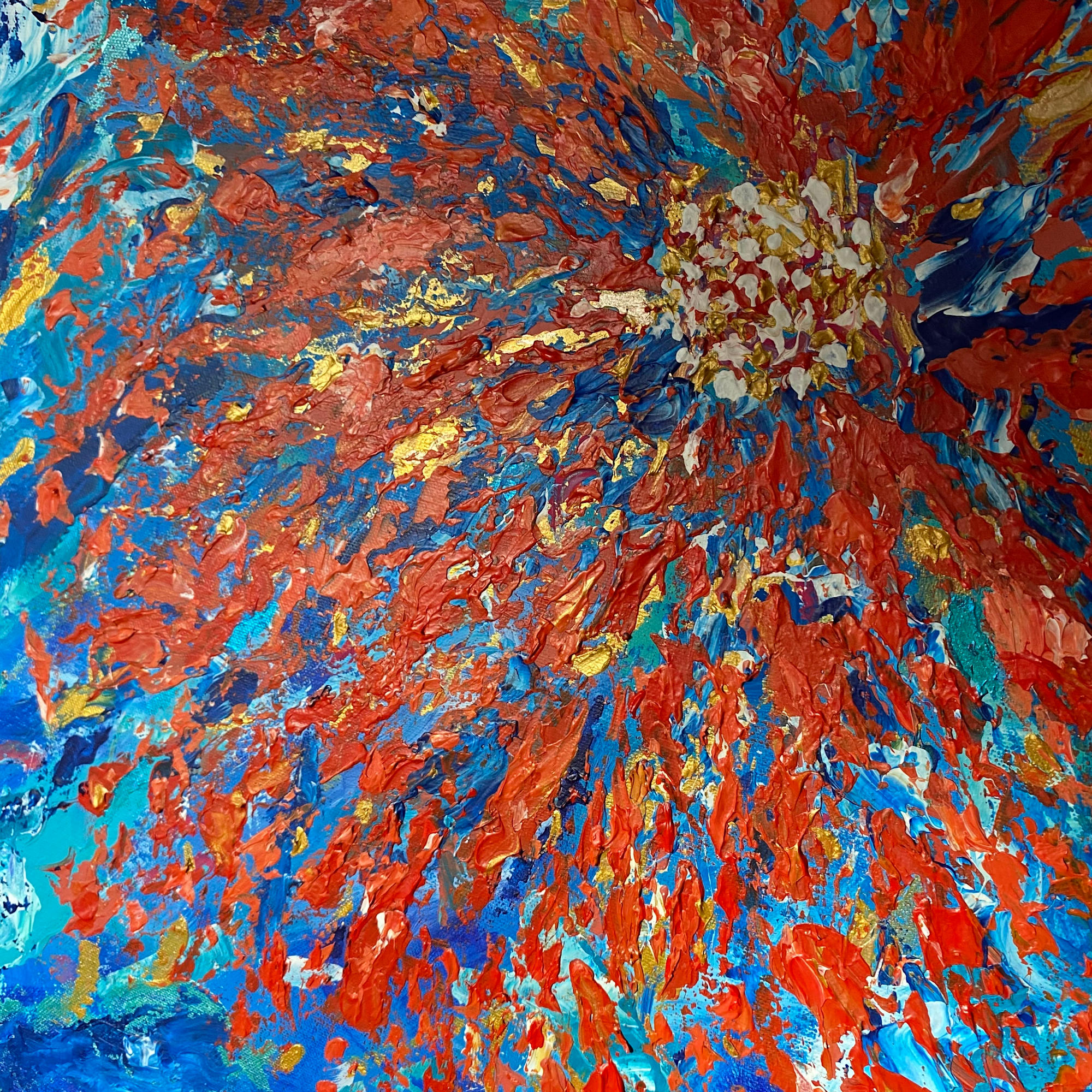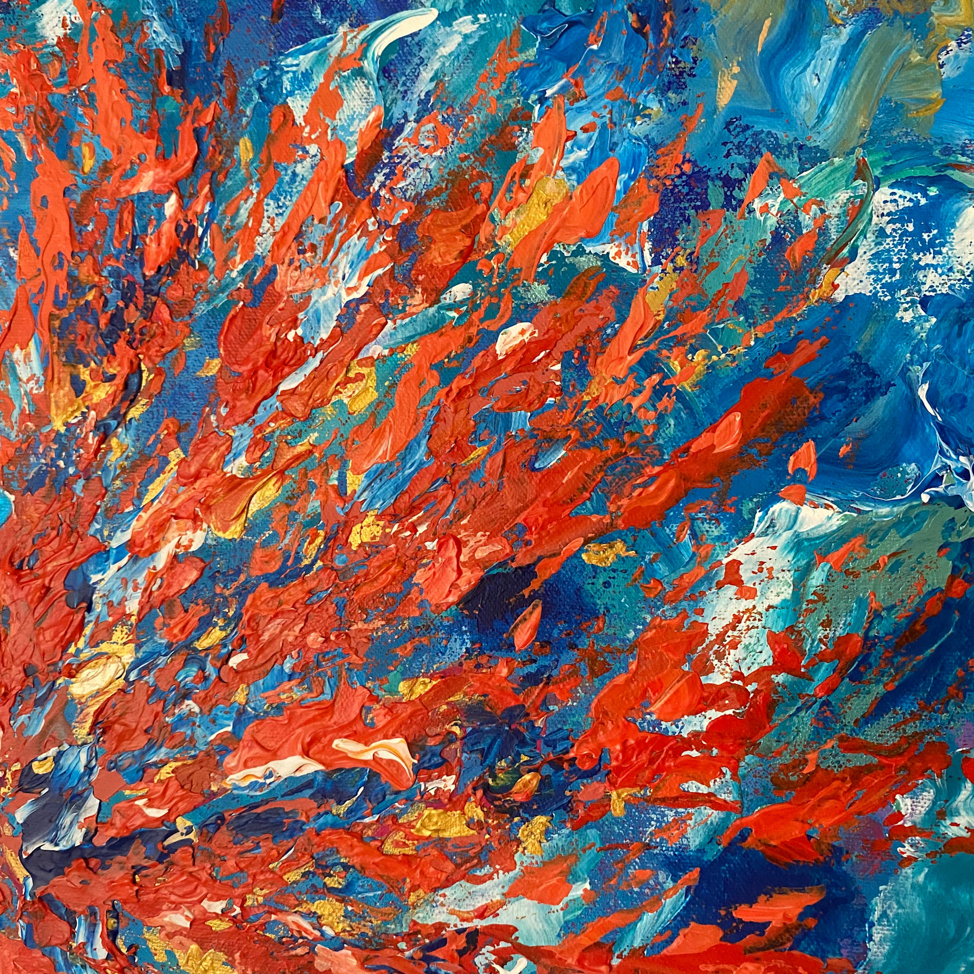 Coral Bloom dances between deep blues and fiery corals, capturing that magical moment when your soul awakens.
