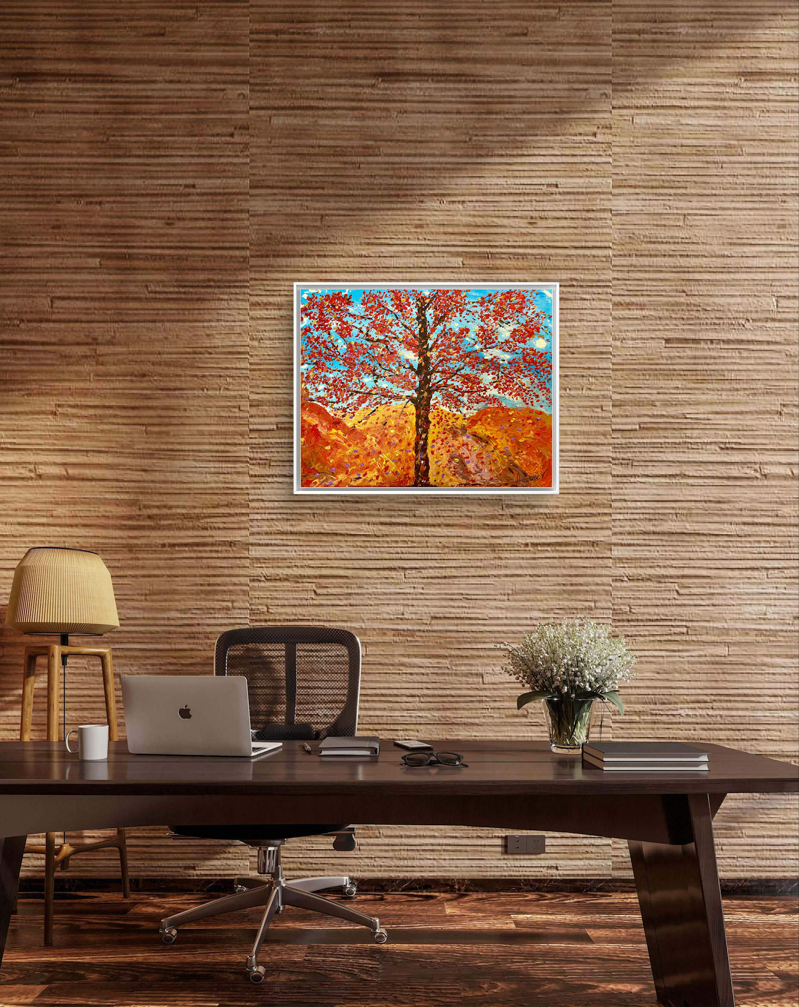 This vibrant artwork presents a majestic tree adorned with leaves in radiant shades of red, gold, and purple—each hue a reflection of life’s many facets. Set against golden hills and a bright blue sky, the brushwork and textures evoke the energy of autumn, celebrating the vitality and joy of existence.