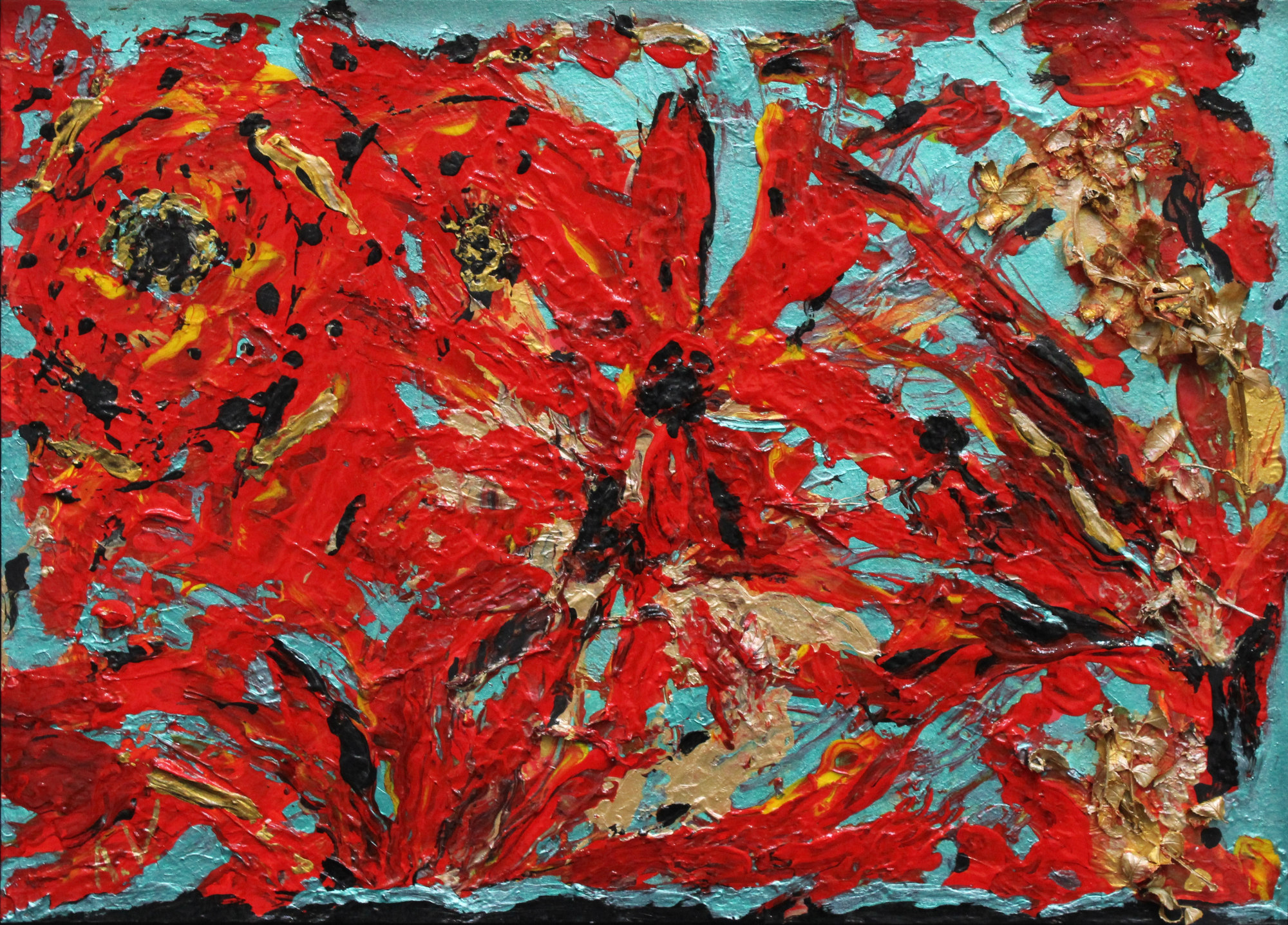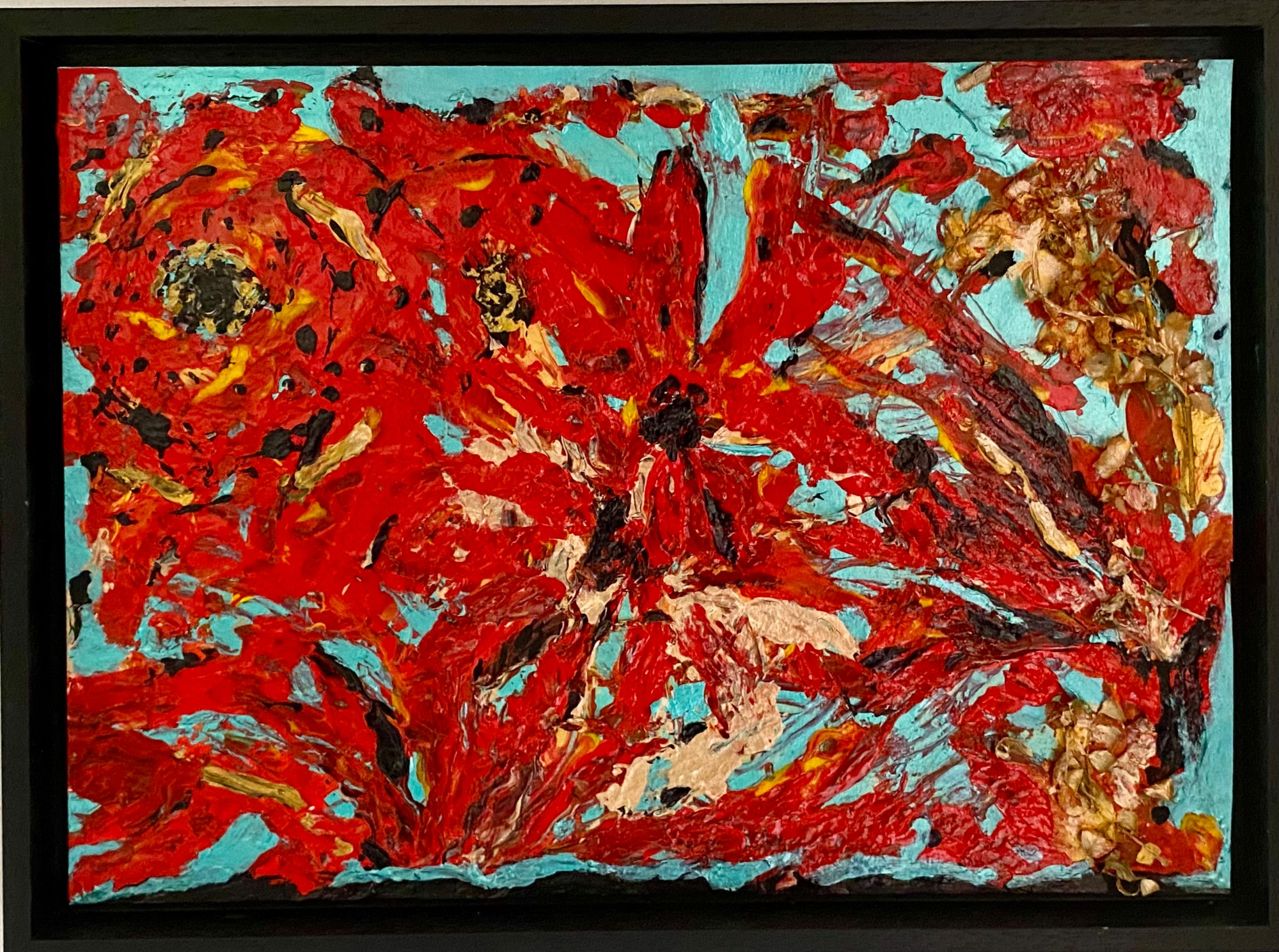 The painting comes with a black wooden frame and dried rose leaves painted in gold. The red flowers coming from the ashes are an expression of self empowerment and expression. The light green background brings balance and soothing to the painting and cools down the passionate flowers.