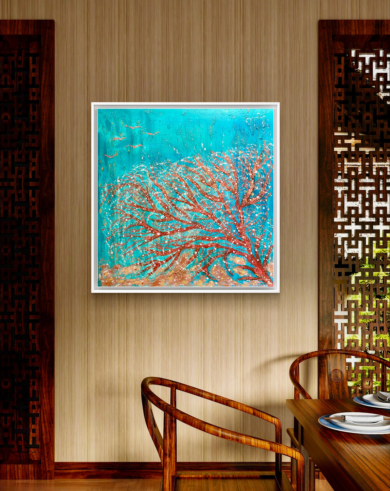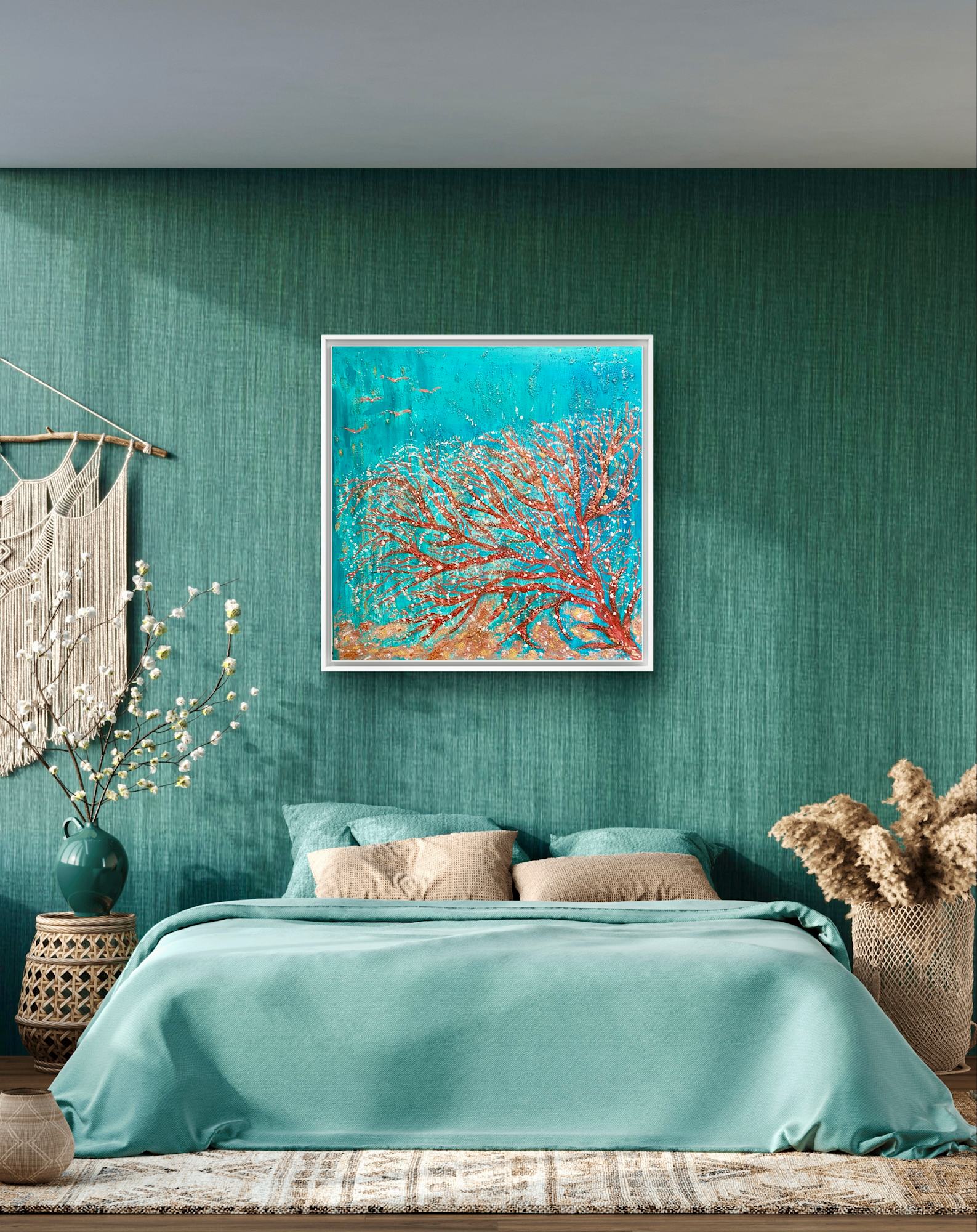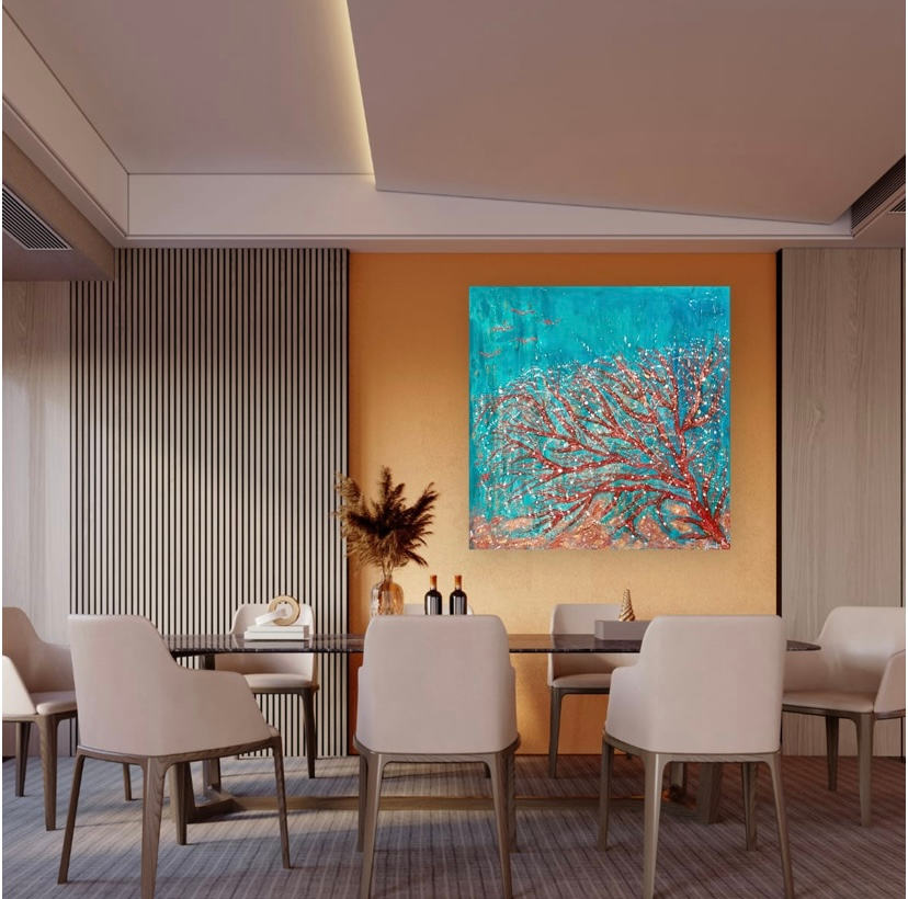 In this vibrant artwork, I intend to transport viewers into an evocative underwater realm, characterised by the striking contrast of deep green turquoise and radiant coral-red hues. The piece captures the essence of marine life, specifically the intricate beauty of coral formations that are often referred to as the "rainforests of the sea."