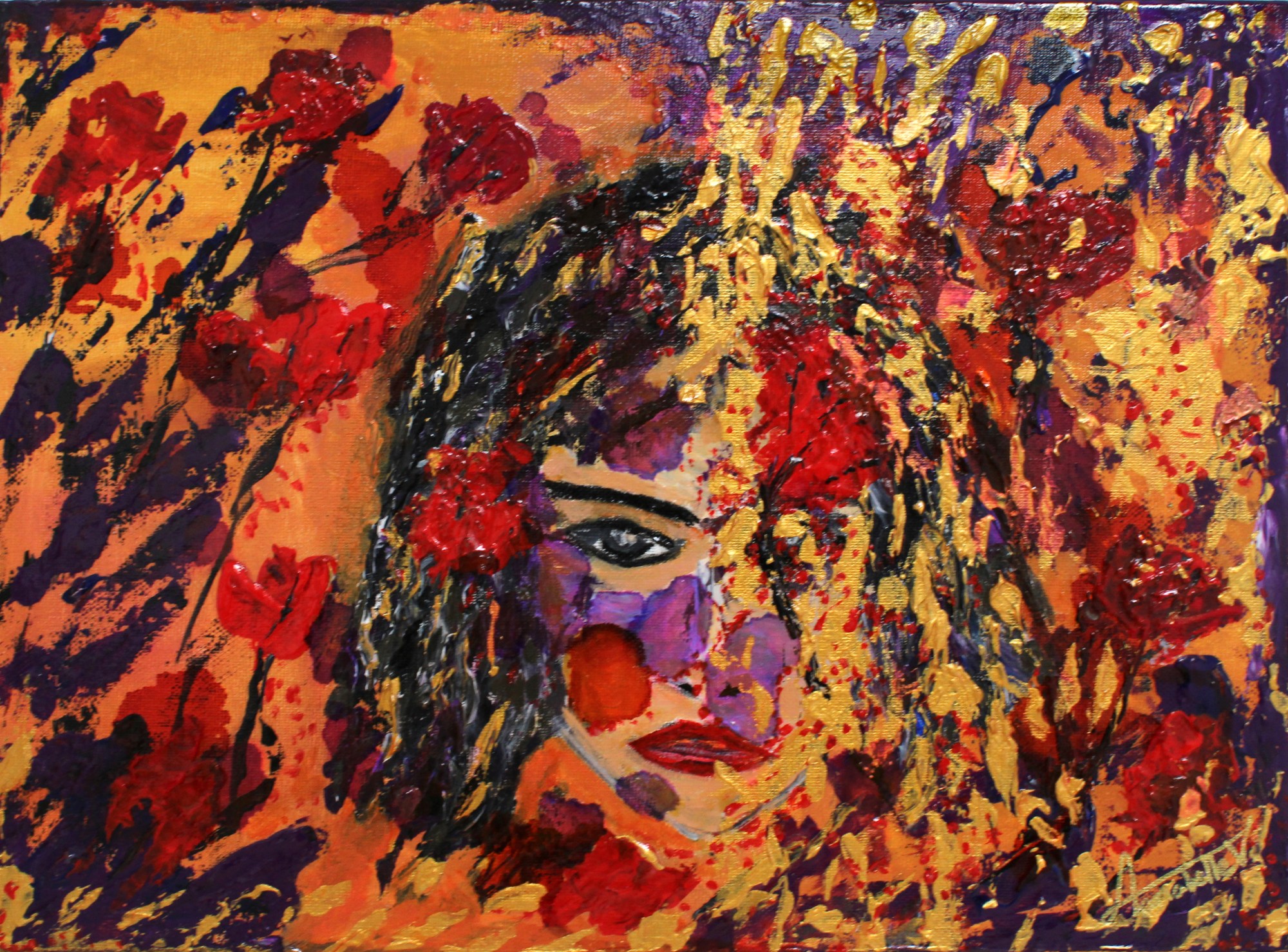 The combination of the girl's face, the red flowers, and the touch of spirituality through gold creates a visually captivating and emotionally resonant piece that invites viewers to contemplate themes of beauty, vitality, and spirituality.