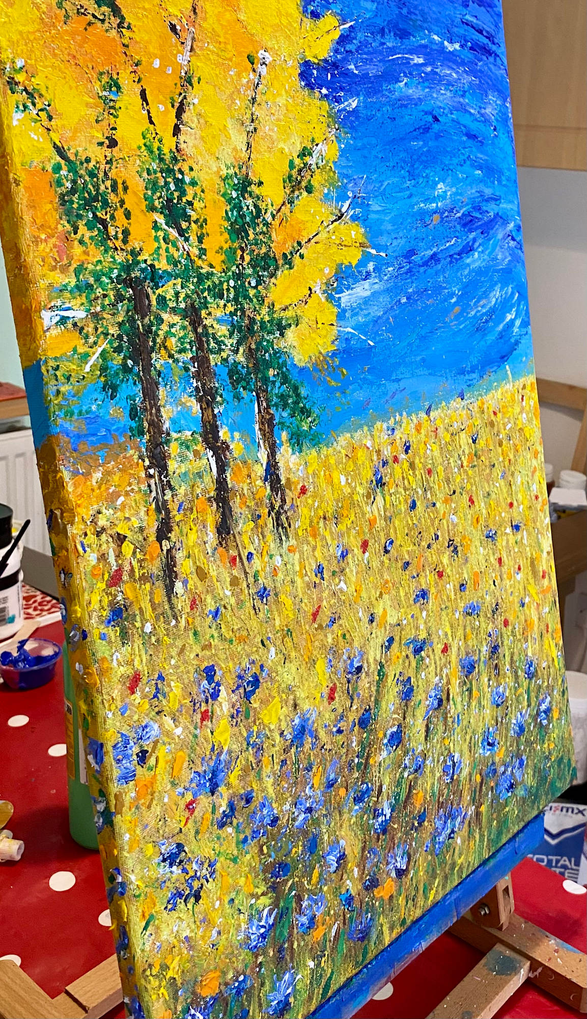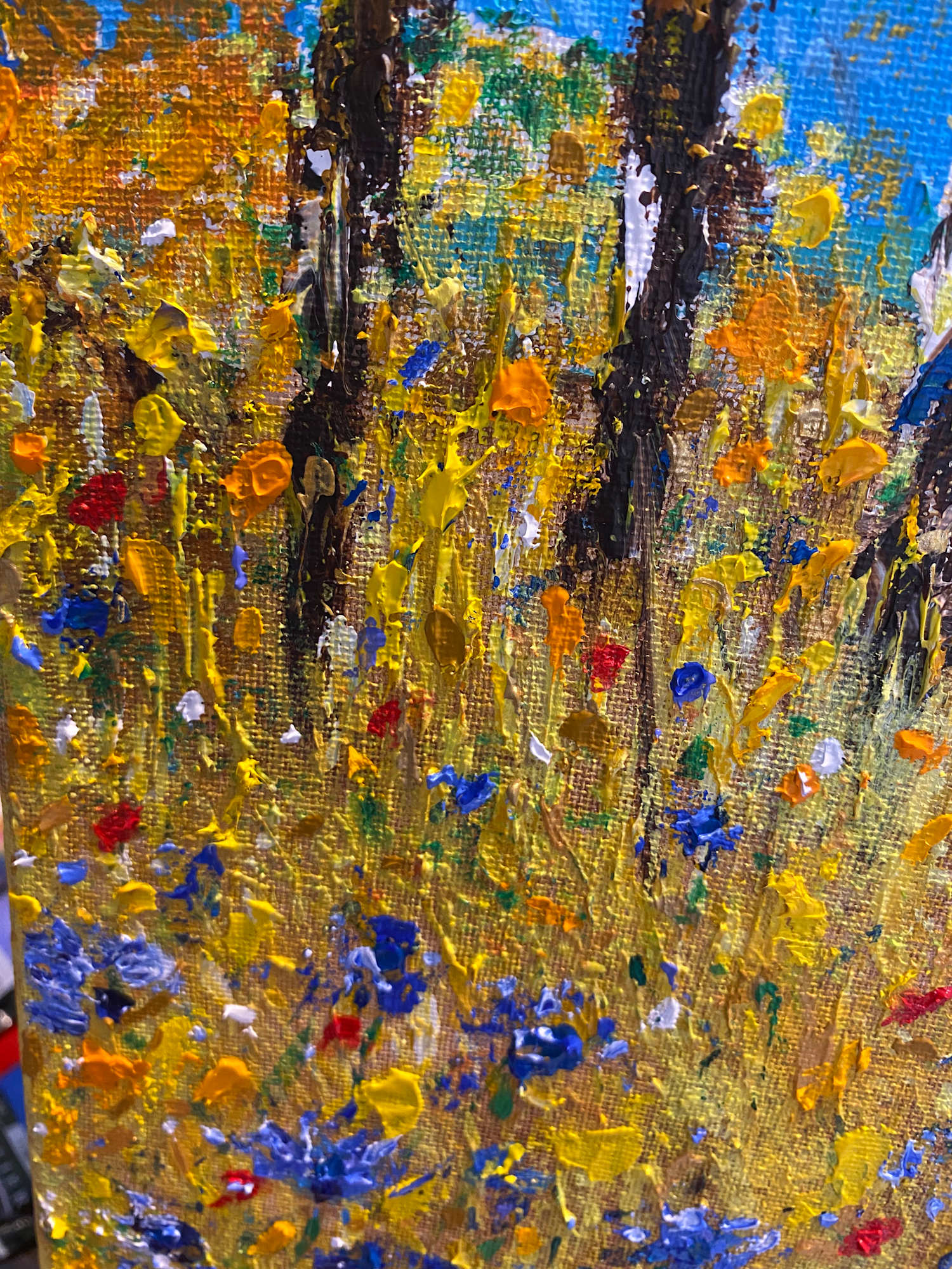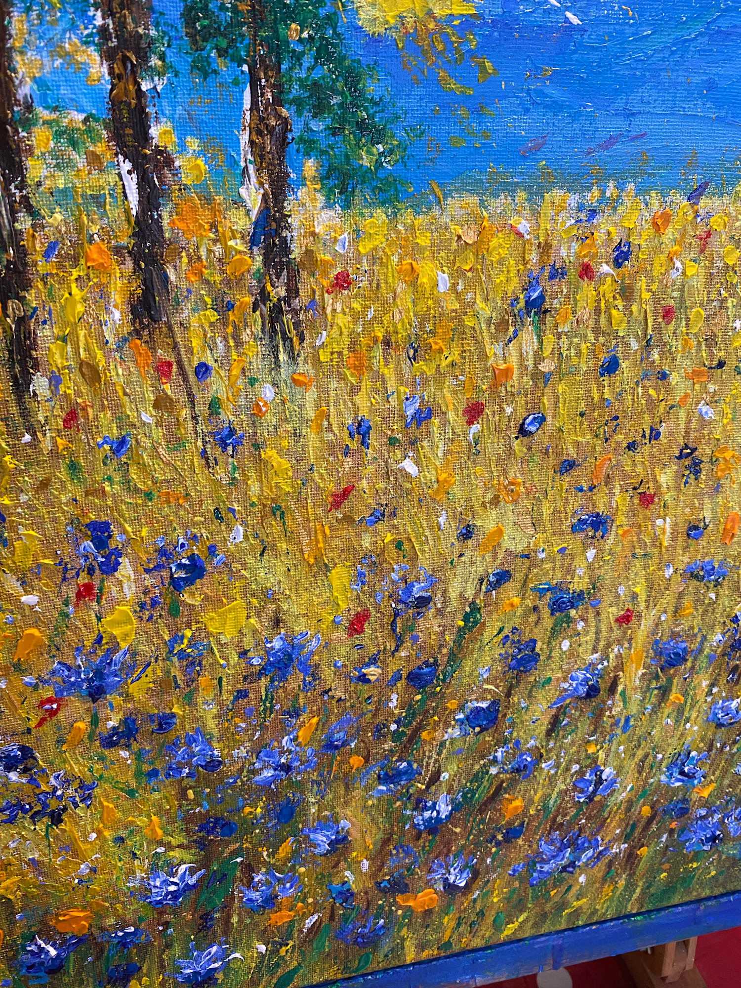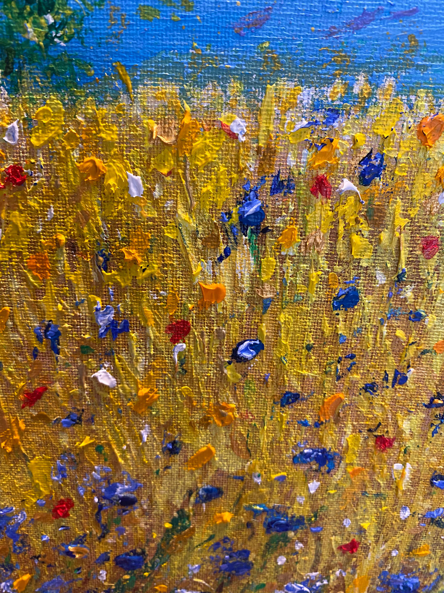 This painting invites you into that moment of pure wonder - where time slows and your gaze floats toward the distant horizon, finding inner peace in nature’s simple perfection. The thick, textured brushstrokes capture not just the visual beauty, but the very essence of that summer reverie: the heat shimmering across the meadow, the gentle rustle of flowers in the warm breeze, and that profound sense of connection to the earth’s abundant grace.