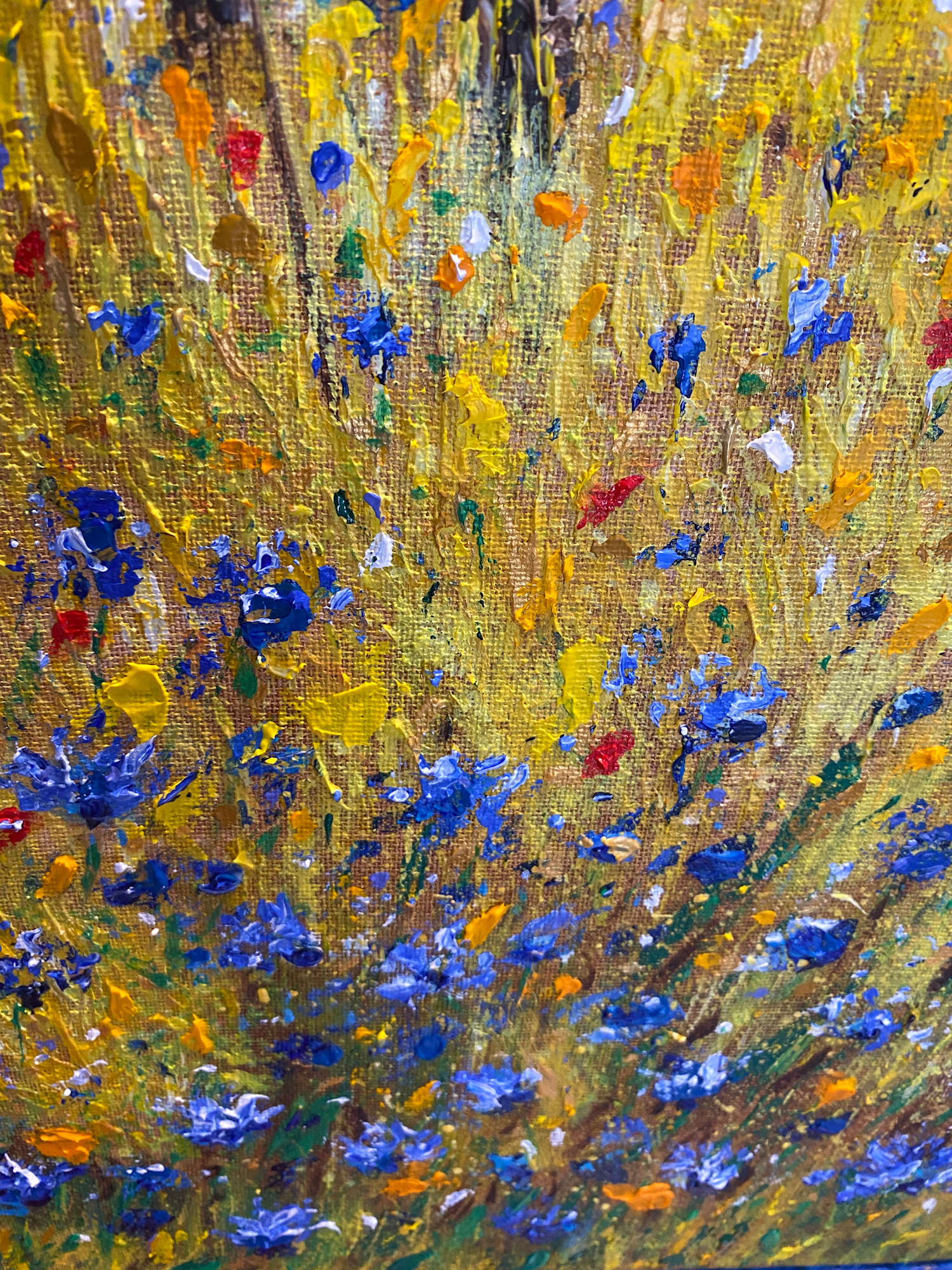 This painting invites you into that moment of pure wonder - where time slows and your gaze floats toward the distant horizon, finding inner peace in nature’s simple perfection. The thick, textured brushstrokes capture not just the visual beauty, but the very essence of that summer reverie: the heat shimmering across the meadow, the gentle rustle of flowers in the warm breeze, and that profound sense of connection to the earth’s abundant grace.