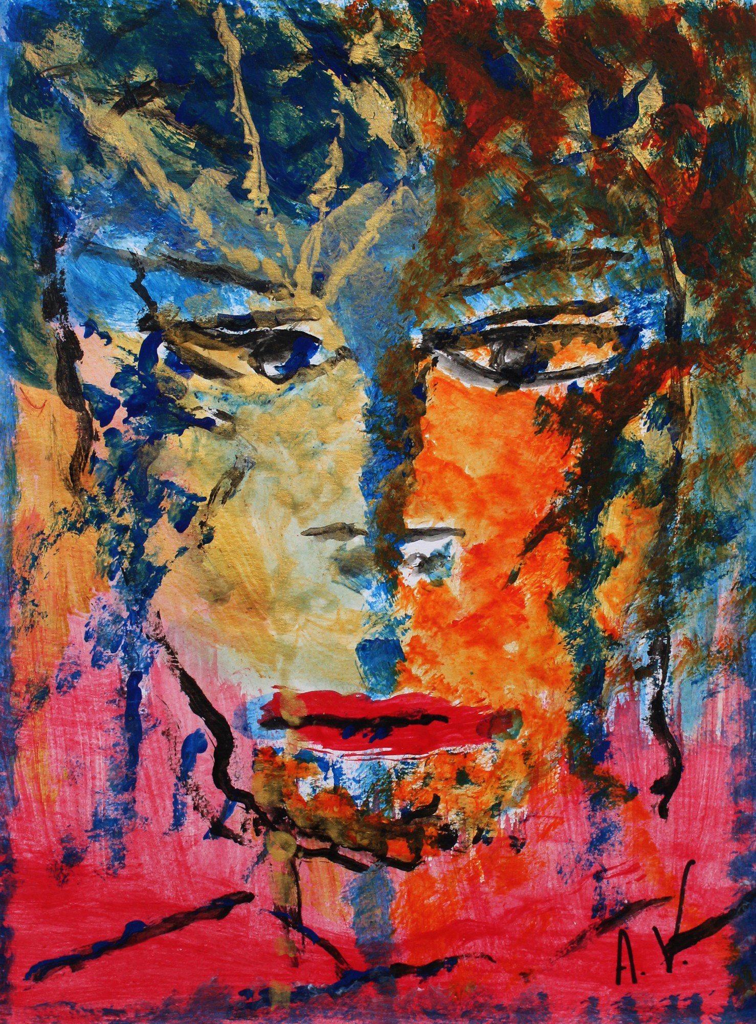 While painting this abstract portrait, I aimed to create a visual representation of the complexities of human emotions and inner struggles. Through the use of vibrant and contrasting colors, expressive brushstrokes, and intense gazes, I sought to convey the intricate relationship between reason and passion, spirituality and heart, and the ultimate harmony that can be found when these aspects blend together. Each stroke of the brush was led by my intuition and my heart, symbolising the layers of our being and the dynamic interplay between different facets of ourselves. My goal was to evoke emotions, provoke thoughts, and invite viewers to reflect on their own inner conflicts and resolutions. This artwork serves as a mirror to the human experience, inviting individuals to explore the depths of their inner worlds and find beauty in the harmonious blend of contrasting elements within themselves.