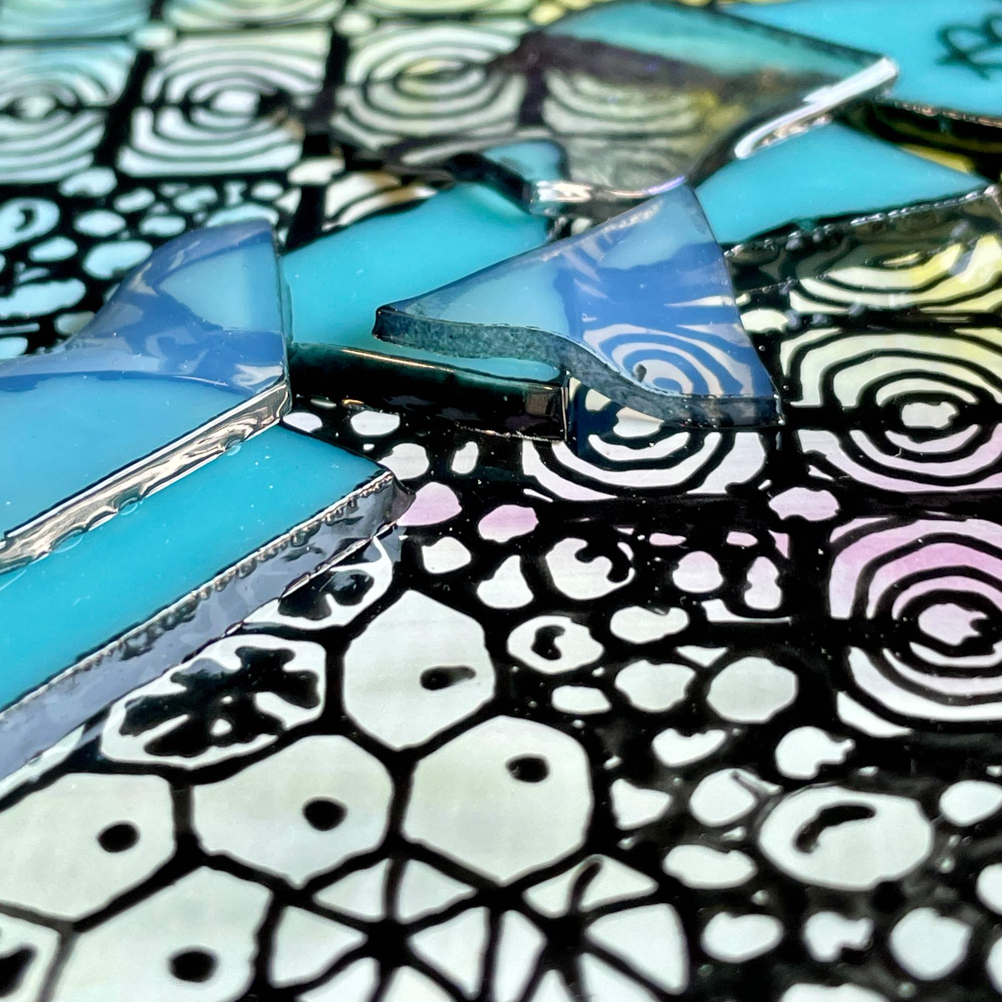 This block is part of my new Nirvana collection. "Bliss" was created by painting with enamels on glass then fired in my kiln. A colorful yellow, pink, white and blue background creates interest, but the star of the show is the intricate surface design in black. On top of this design I layered light blue and clear glass pieces for texture. I really love the way this one came out. Although the surface designs are time consuming, there is a zen quality to them. It is very relaxing creating the designs. I added a painted glass design (tattoo) on the gold side of the block which mimics the front and adds interest.