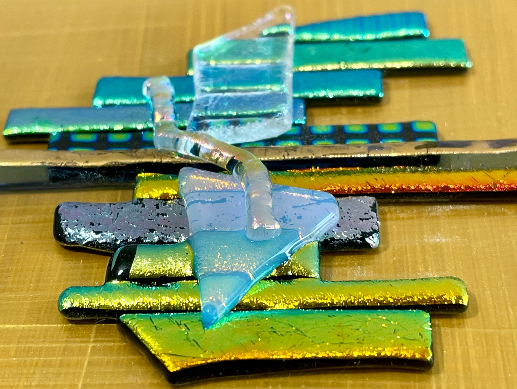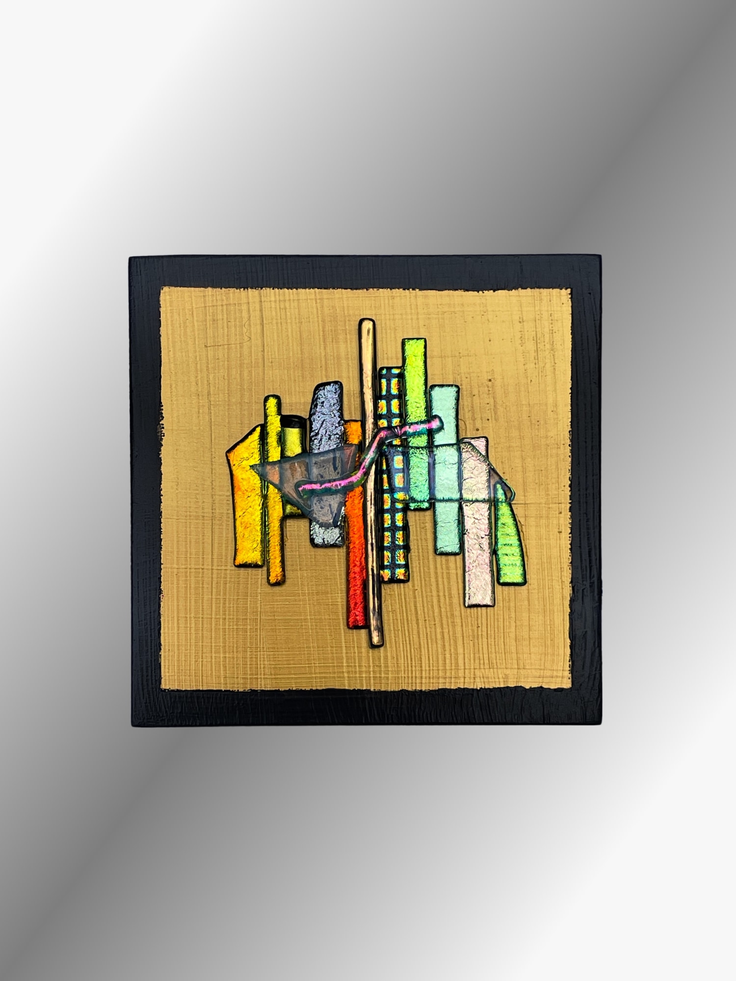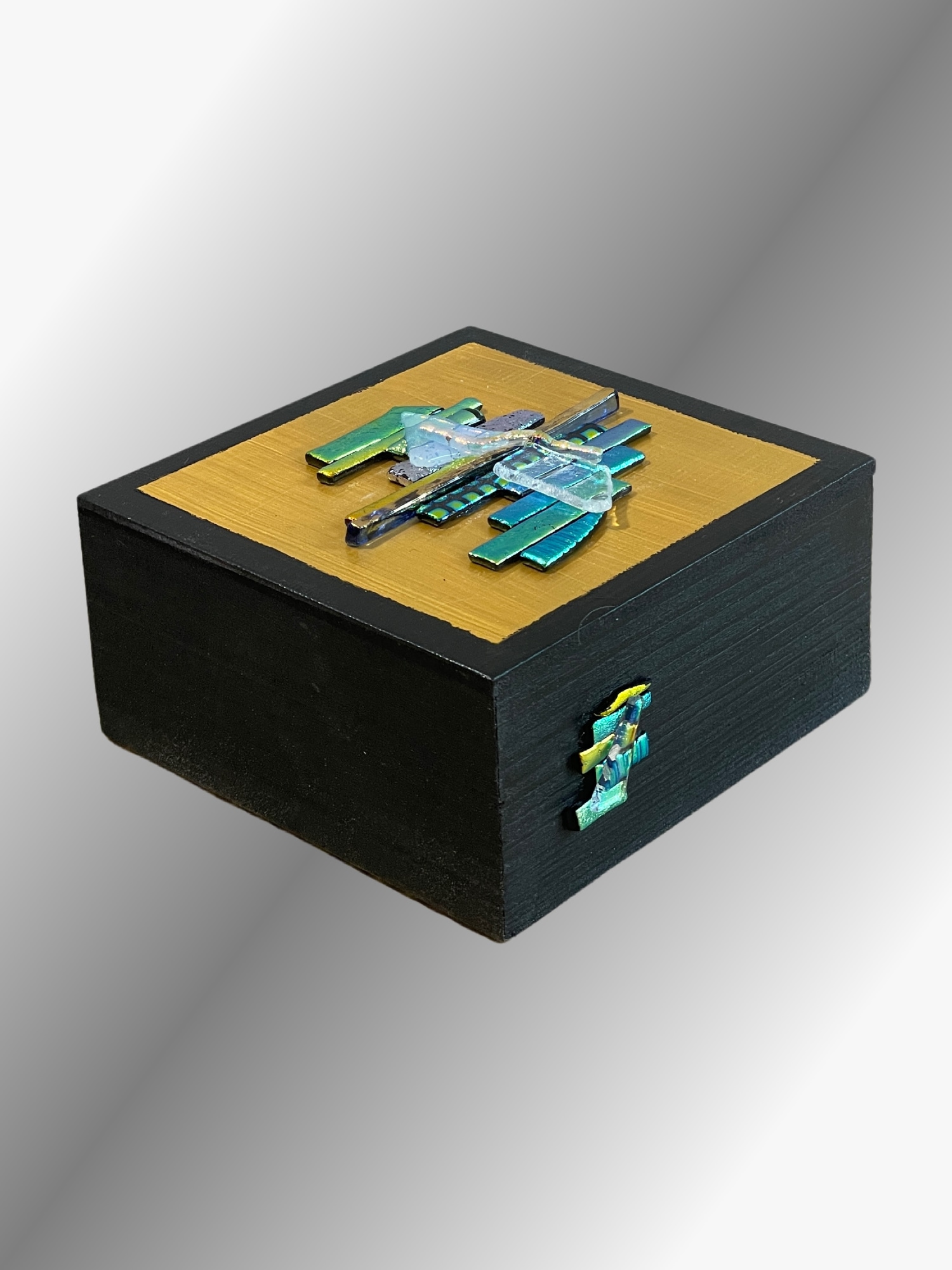 "Charmed" is a stunning fused glass art piece that will add a touch of elegance and intrigue to any space. The dynamic dichroic glass design shimmers and shifts in the light, creating a truly magical and otherworldly effect. Mounted on a sleek gold painted wood block with black painted sides, "Charmed" is a sophisticated and eye-catching piece that can stand alone as a statement art piece or be coupled with other blocks to create a striking, cohesive display. It is a unique piece, making it a one-of-a-kind addition to any fused glass art collection. Experience the enchanting beauty of "Charmed" and elevate your space with its captivating presence.