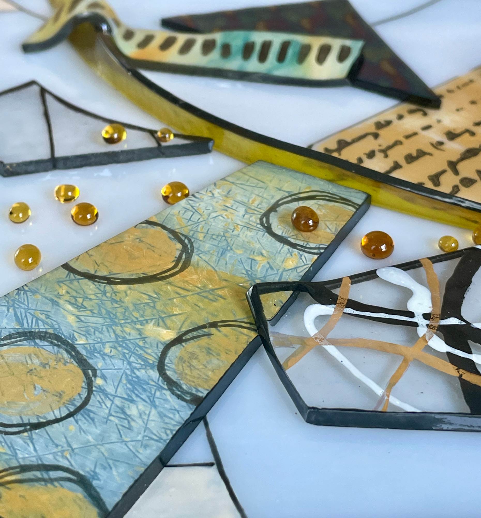 "Golden Fantasy" is a one-of-a-kind abstract Art Deco influenced layered fused glass artwork. This exquisite piece features a harmonious blend of blues, black and golds, accentuated with black highlights, creating a captivating visual experience. The artwork is intricately designed with lots of textural interest, adding depth and dimension to the composition. It is expertly raised mounted on a 24"x24"x2" wood panel painted gold, featuring different size black circles and black painted sides for a modern touch. Bring a touch of elegance and sophistication to any space with this mesmerizing fused glass art piece.