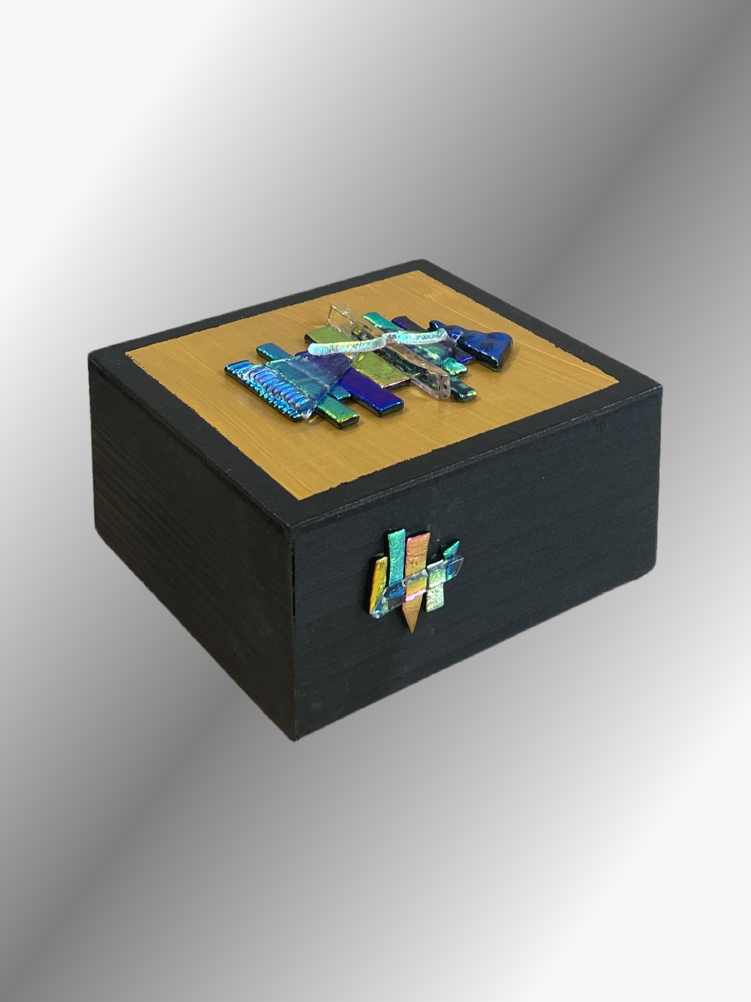 "Magic" is a stunning fused glass art piece that will add a touch of elegance and intrigue to any space. The dynamic dichroic glass design shimmers and shifts in the light, creating a truly magical and otherworldly effect. Mounted on a sleek gold painted wood block with black painted sides, "Magic" is a sophisticated and eye-catching piece that can stand alone as a statement art piece or be coupled with other blocks to create a striking, cohesive display. It is a unique piece, making it a one-of-a-kind addition to any fused glass art collection. Experience the enchanting beauty of "Magic" and elevate your space with its captivating presence.