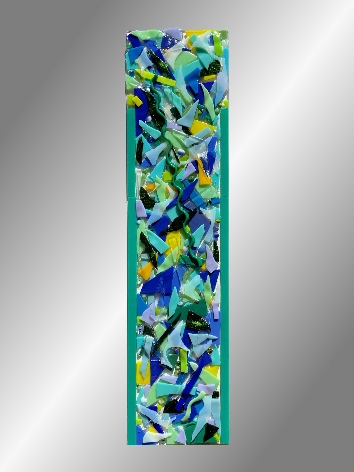 "Peaceful Cascade" is a captivating piece of art crafted from fused glass. This tall, narrow, and rectangular mosaic is a spectacle of vibrant colors and intricate patterns. Dominated by hues of blue, green, and white, the design also incorporates smaller bursts of yellow and other shades, creating a visually stimulating array that draws the eye into its depths. The mosaic is composed of variously shaped pieces, each meticulously placed to form an abstract pattern that evokes the natural beauty and dynamic energy of a garden. This is art that not only captures light in a mesmerizing way but also offers a sense of depth and movement, making it a stunning centerpiece for any space.