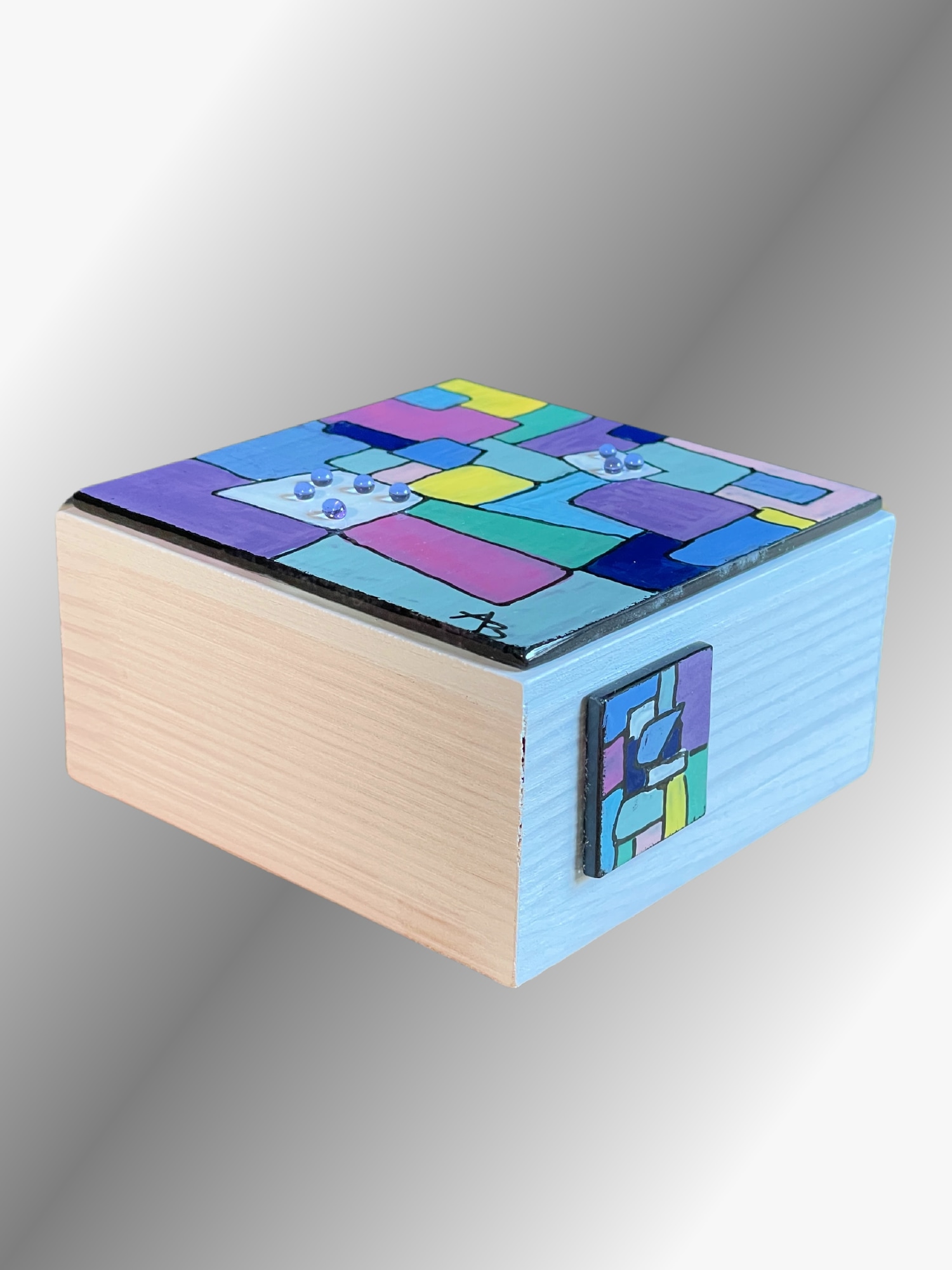 Introducing "Playtime," a delightful fused glass art piece bursting with a joyous array of colors in a mid-century modern aesthetic. This artwork celebrates geometric harmony with a lively dance of rectangular and square shapes, each adorned with bold outlines. The vibrant palette of blue, purple, yellow, green, and pink creates a visual symphony for the senses. Intriguing white shapes with transparent lavender glass dots add a touch of mystery and invite exploration. The unique process of painting with enamels for fused glass results in a harmonious yet adventurous composition. "Playtime" captures the joy of color and texture, offering a playful escape into a world of geometric fantasy.