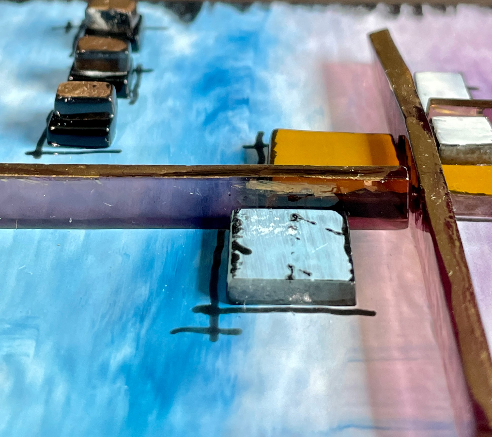 "Radiance" is a small contemporary abstract piece is crafted from fused glass. It features a smooth gradient background transitioning from blue to purple, overlaid with geometric shapes in gold, white, and black. Special enamels were used to paint the background, topped with layered glass, including transparent purple and gold, creating depth and visual intrigue. I added a painted glass design (tattoo) on the whitewashed side of the block which mimics the front and adds interest.
