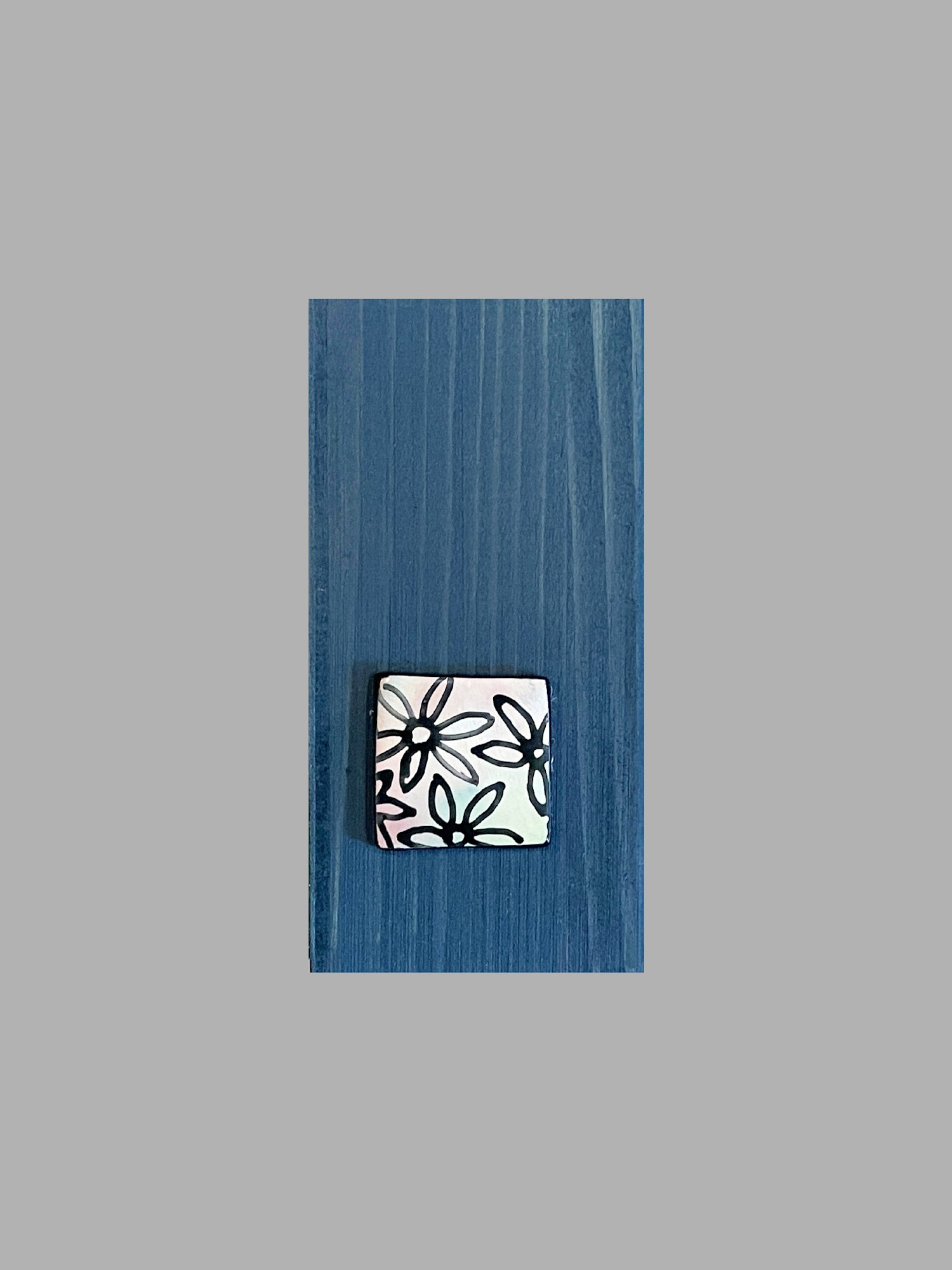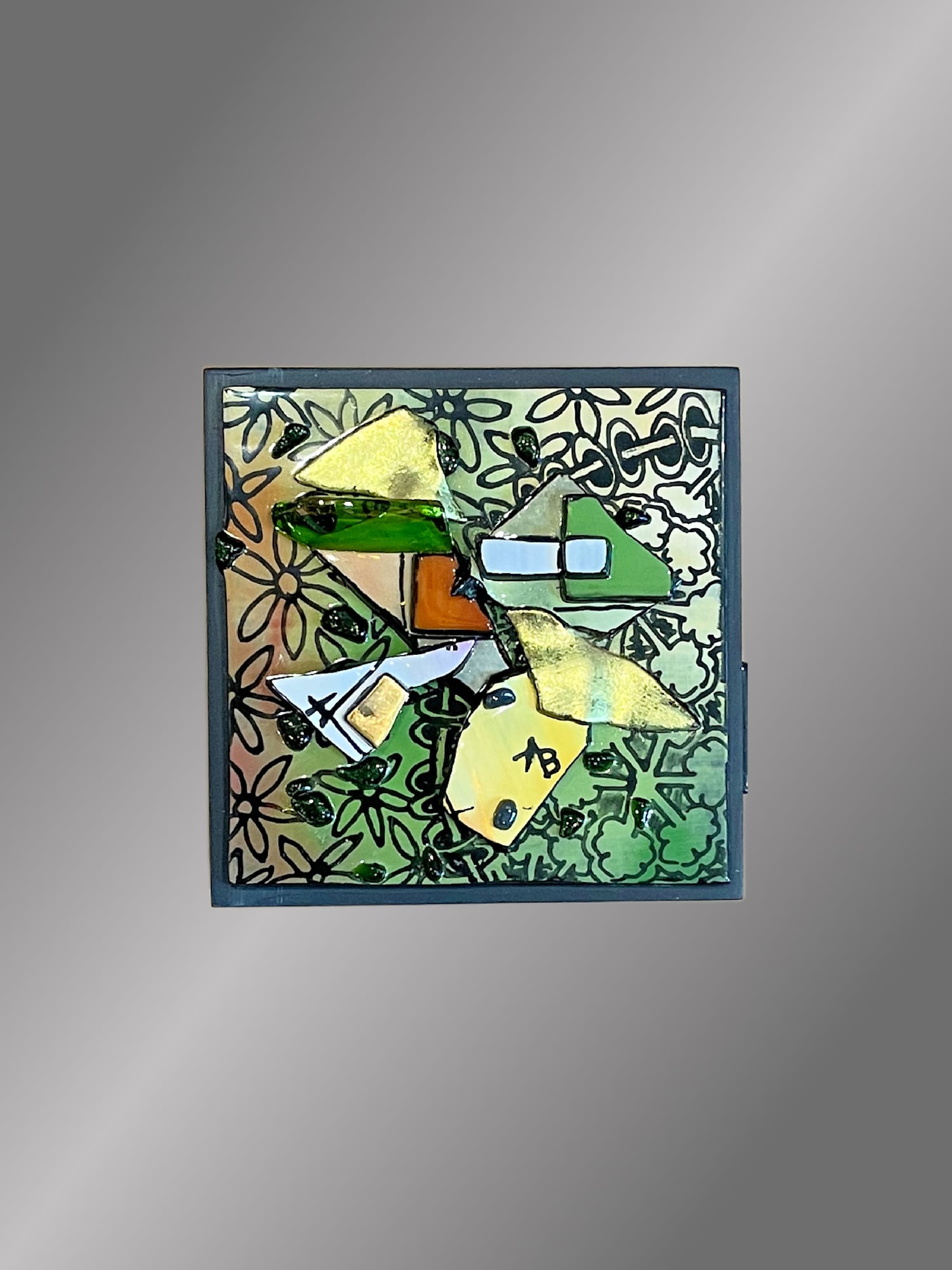 This block is part of my Nirvana collection. "Relax" presents a compact, structured fused glass composition where pattern and form intersect with clarity. The piece is organized into distinct sections, each carrying its own texture—from organic floral elements to precise grids, dots, and crosshatch patterns. Central to the work, clusters of geometric fused glass shapes in subtle pastel tones are outlined sharply, providing focus and order against the vibrant blue backdrop. A slim black border frames the artwork, grounding the arrangement and adding a refined touch. The overall effect is calm and intentional, balancing varied surfaces with a cohesive, measured rhythm.
