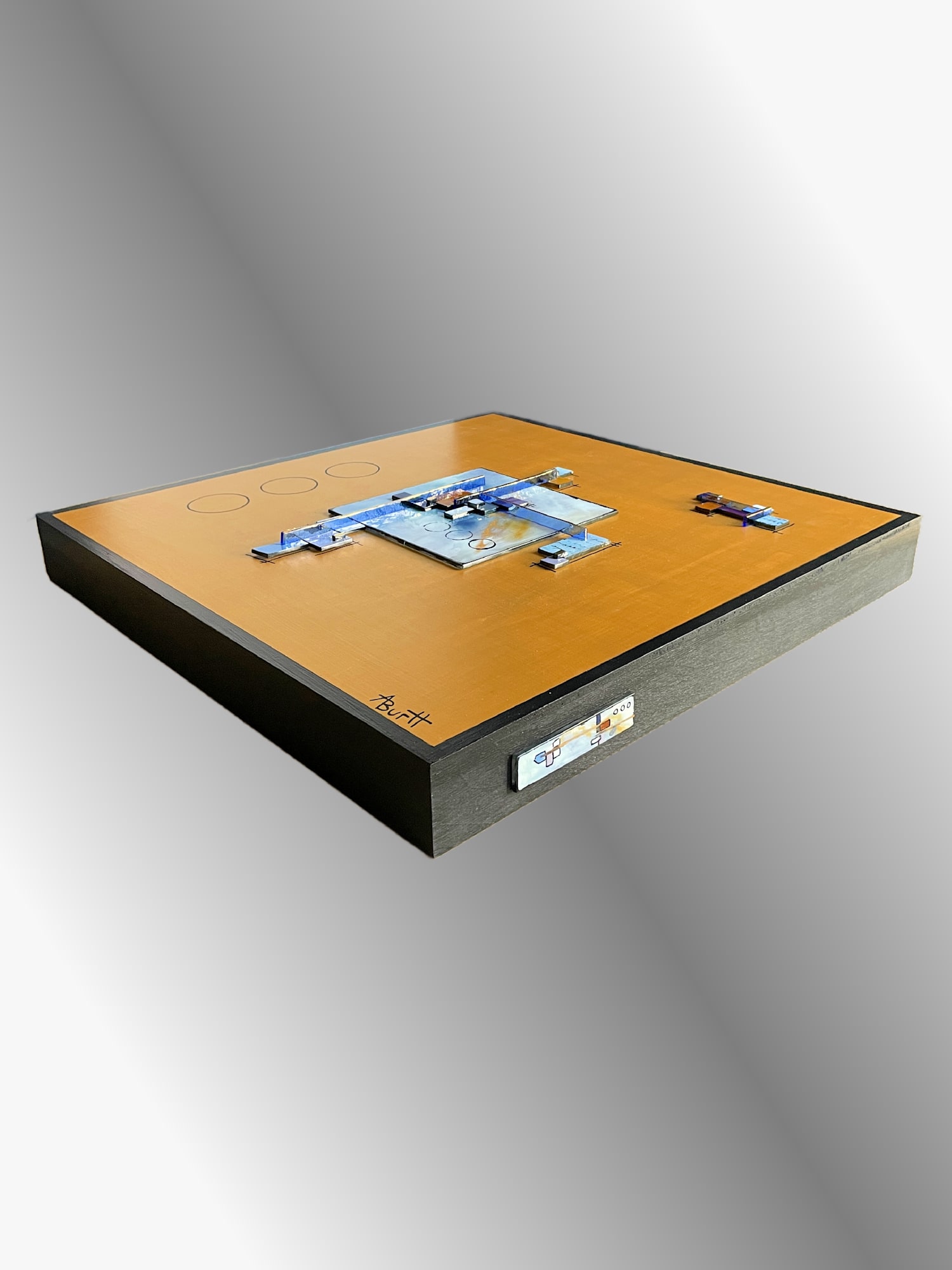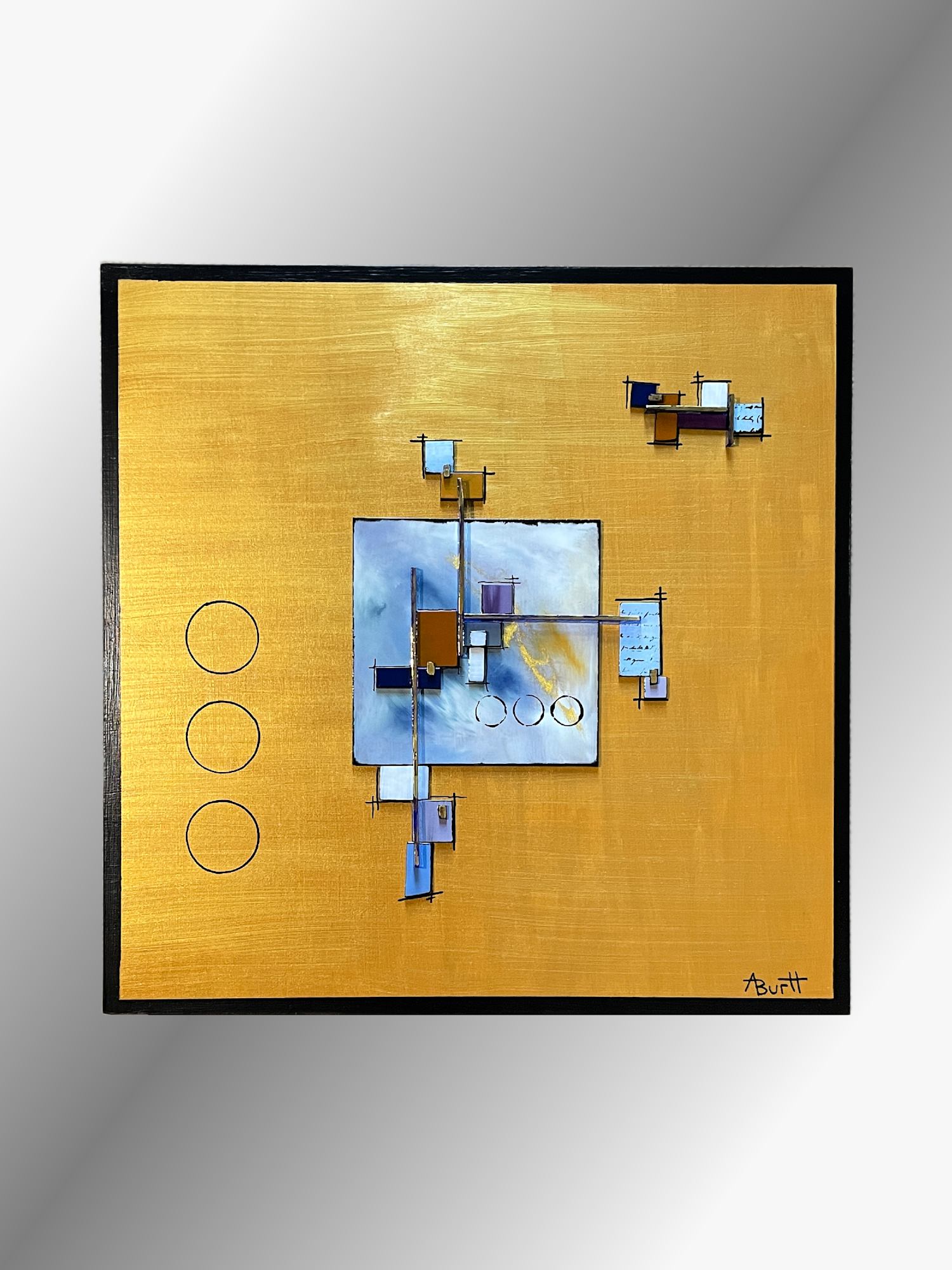 "Shadow Muses" is a stunning new twist on my popular abstract landscape/cityscape series. This piece features a textured fused glass background design, painted in vibrant blue and gray enamels, with fused glass components added to the surface for a multidimensional effect. The design extends beyond the central glass panel onto a luxurious gold-painted wood panel, with sleek black painted sides for a modern, polished look. This stunning artwork is the perfect addition to any modern home or office, adding a touch of urban elegance and harmony to your space. Bring a piece of the city skyline into your home with "Shadow Muses."