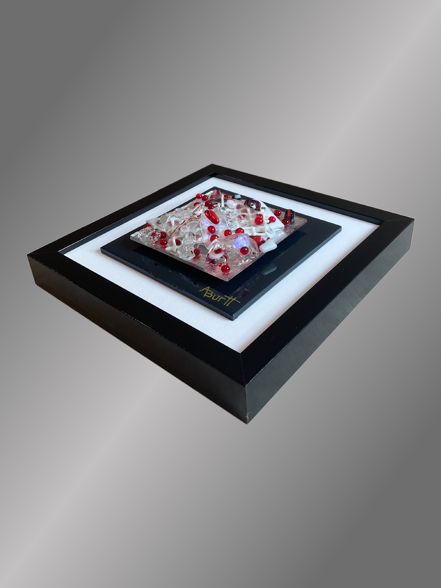 "Splinter" is part of an abstract fused glass series of small complex designs. This red, black, white and clear glass design has lots of texture and dimension. The silver leaf background and black painted wood surface, finished with shiny resin gives it even more "pop!" The entire design is mounted to a black frame with white mat and wired for hanging. "Splinter" is 9"x 9"x 2".