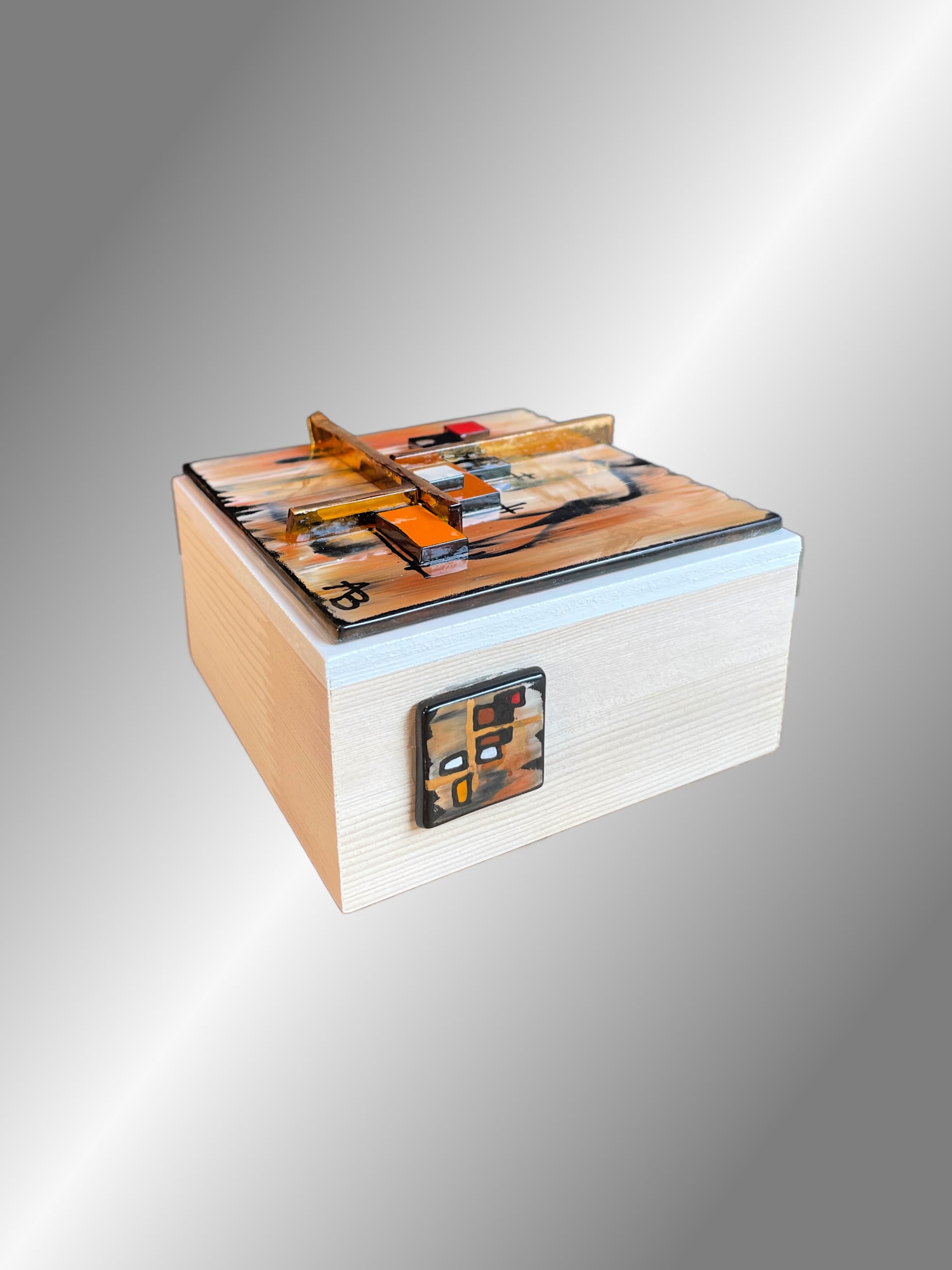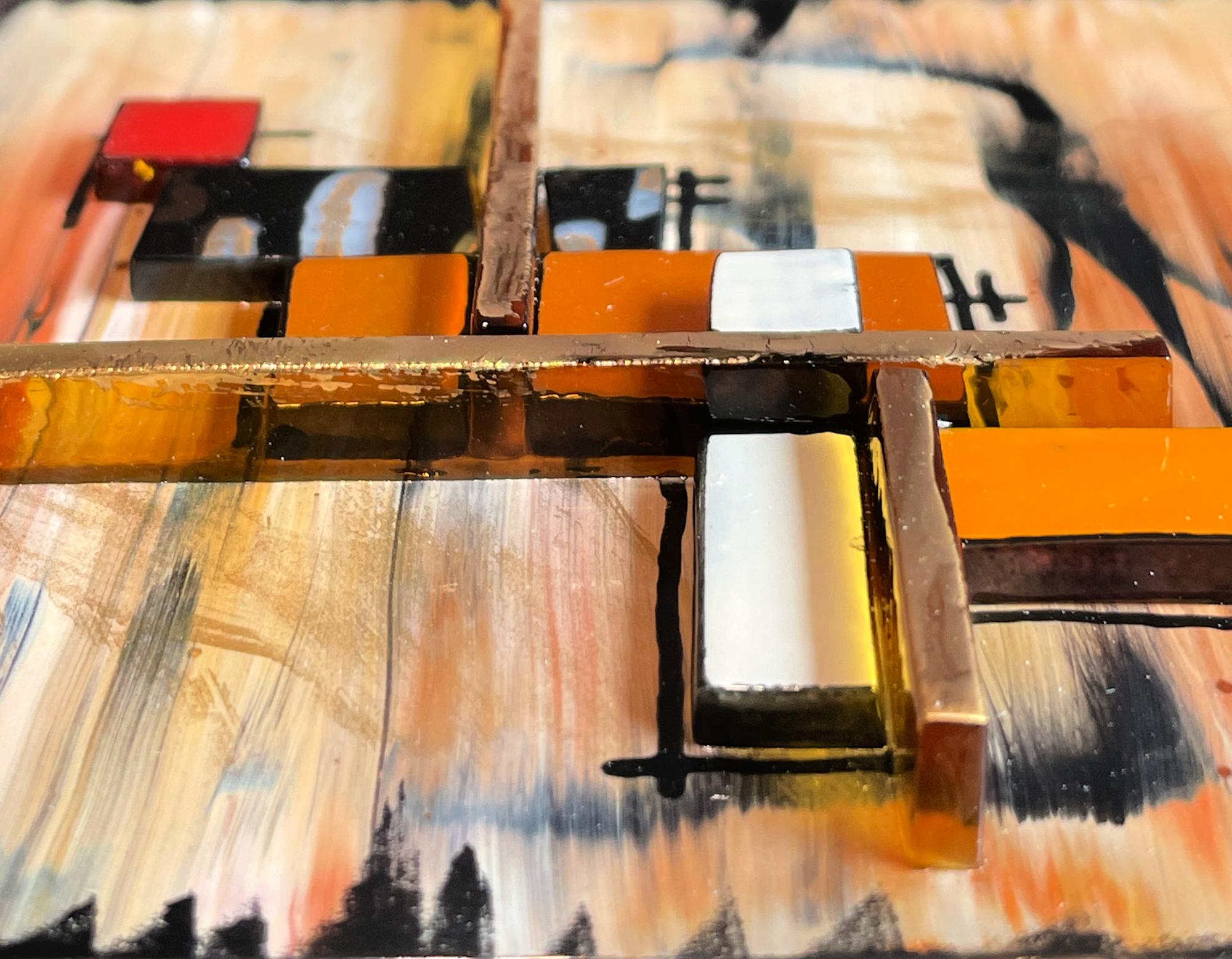 This block is part of my Glasscapes collection. "Strata" was created by painting with enamels on glass then fired in my kiln. An "earthy" colored background creates interest, but the star of the show is the transparent amber glass placed on edge with brilliant gold along the top. The background design is layered with multiple complementary colored glass pieces for texture. I really love the way this one came out.