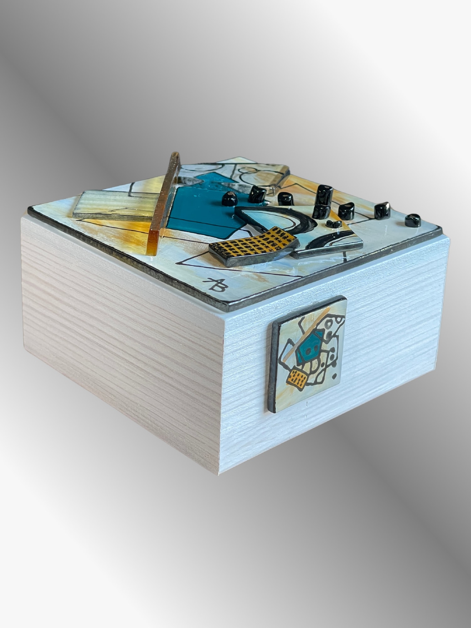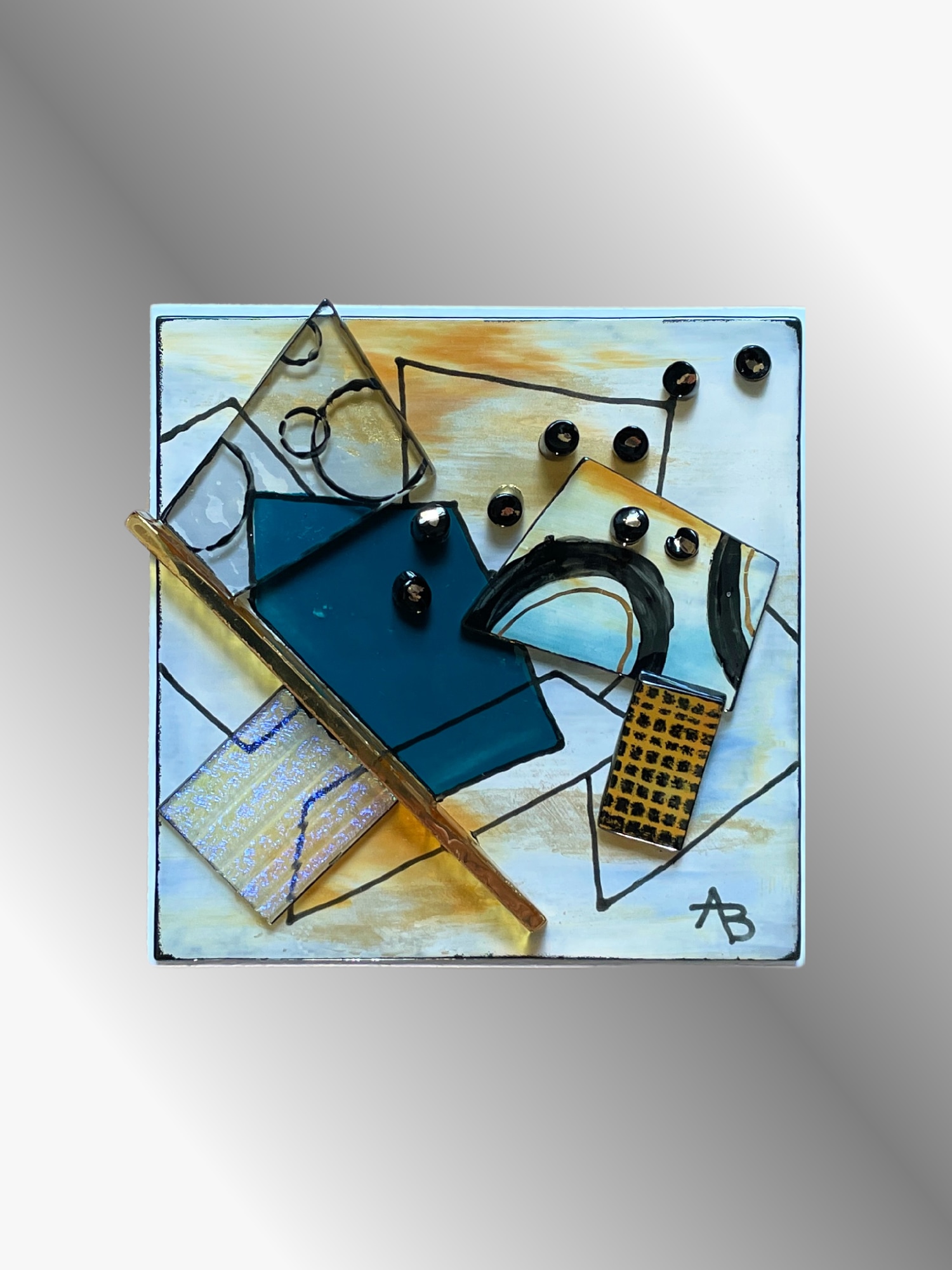 Prepare to be enchanted by "Vortex," a captivating abstract marvel crafted from fused glass. This intricate composition merges a mixed media vibe on a flat base, with shapes and textures coalescing in a seemingly haphazard yet perfectly balanced symphony. The pièce de résistance is a transparent amber glass stip on end slicing diagonally across the piece, infusing dramatic flair. Black dots and appear sporadically, adding playful movement and depth. This modern masterpiece exudes thoughtfully orchestrated chaos, inviting viewers to lose themselves in its mesmerizing balance. Creating "Vortex" involved layering multiple designs of fused glass, each layer painted with special enamels for kiln-formed glass. Imagine amber transparent glass standing tall, crowned with golden paint—pure magic. Meticulously crafted yet whimsically playful, "Vortex" is an irresistible addition to any art collection. Let its swirling charm whisk you away!