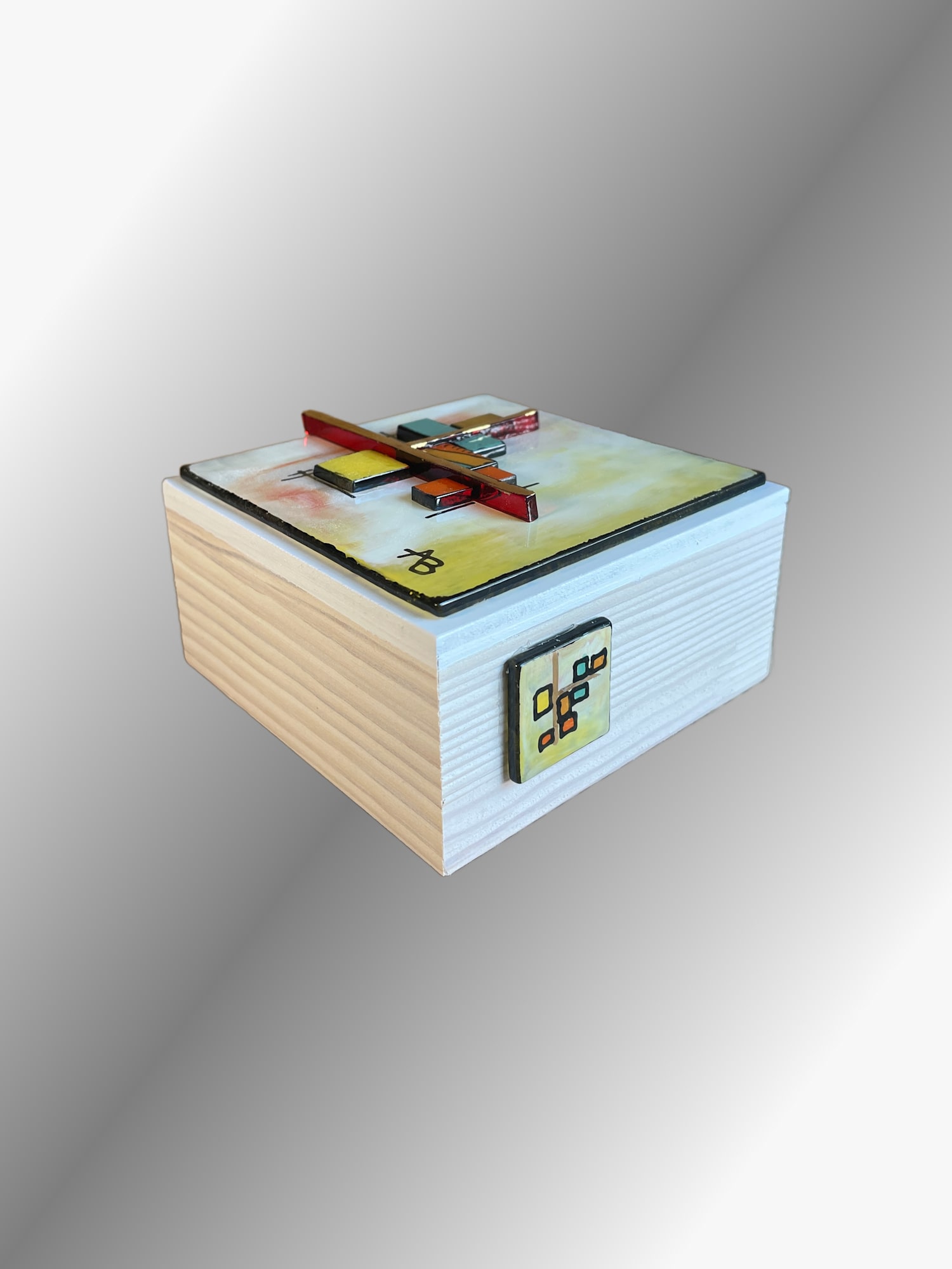 This block is part of my Glasscapes collection. "Wisdom" was created by painting with enamels on glass then fired in my kiln. A colorful yellow, orange and white background creates interest, but the star of the show is the transparent orange glass placed on edge with brilliant gold along the top. The background design is layered with multiple complementary colored glass pieces for texture. I really love the way this one came out.