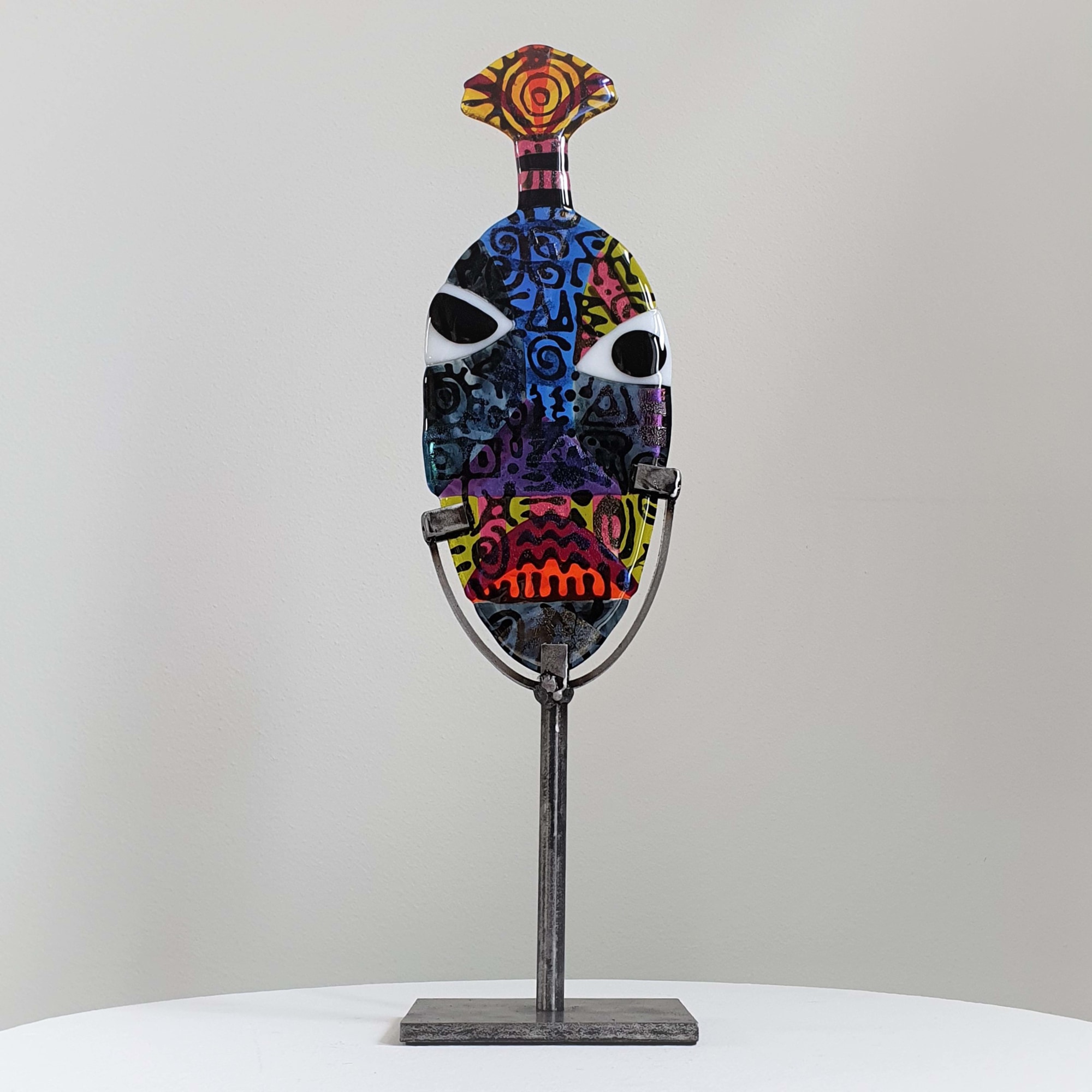 Transparent glass in shades of blue with details in green, pink, yellow and red. Front partial iridescent surface with a clear powder overlay pattern. Relief texture with an African inspired print on the back. 'Zulu' comes with a tuft on the head.