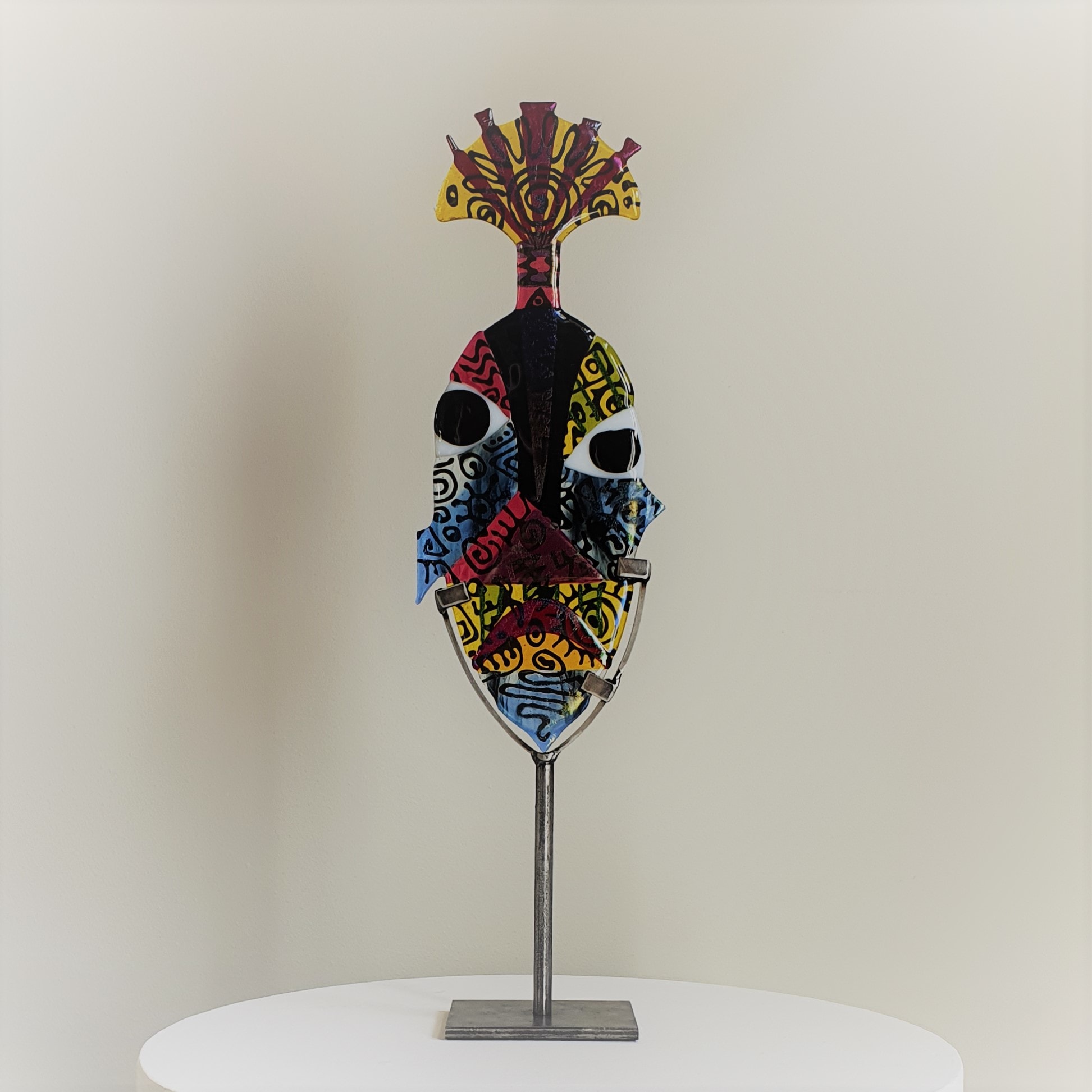 Transparent glass in shades of blue, purple and pink. Details in green, yellow and red. Front partial iridescent surface with a clear powder overlay pattern. Relief texture with an African inspired print on the back. 'Zulu' comes with a tuft on the head.