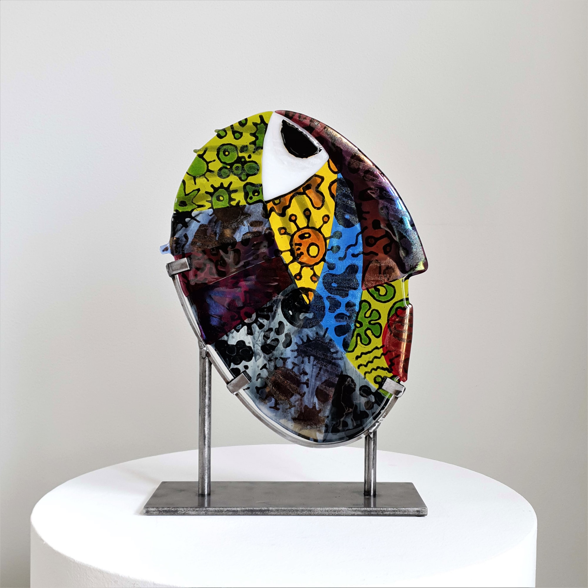 Disc of 6 mm transparent fused glass with an opaque eye. Mixed colors. Front partial iridescent surface with a powder overlay pattern.