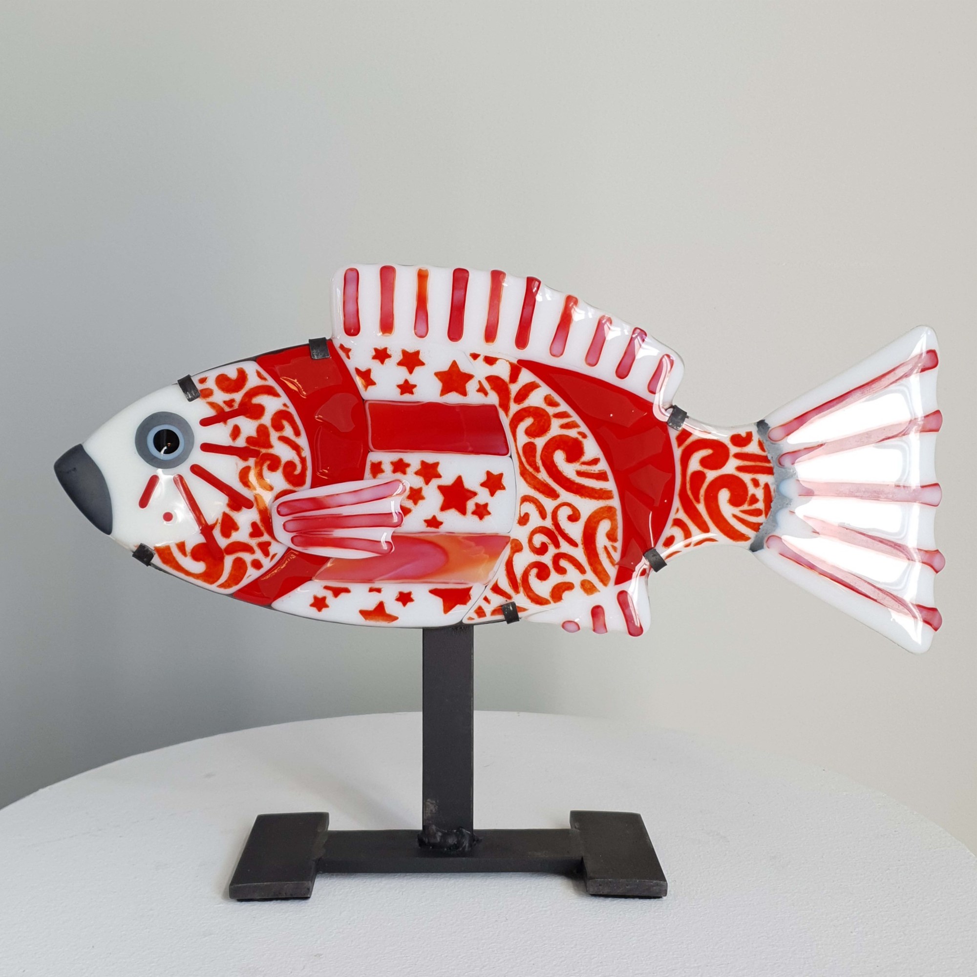 Inspired by Japanese ornamental fish. 'Kohaku' is the name of a classic red and white koi. 6 mm thick opaque glass in a mix of red/white colors with a overlay powder print in varied pattern. Details in the face are of Bullseye 'Steel blue' glass, witch oxidizes to a matte metal look on the surface during firing. Mounted in a metal sheet backing welded to an iron stand. Head to the left.