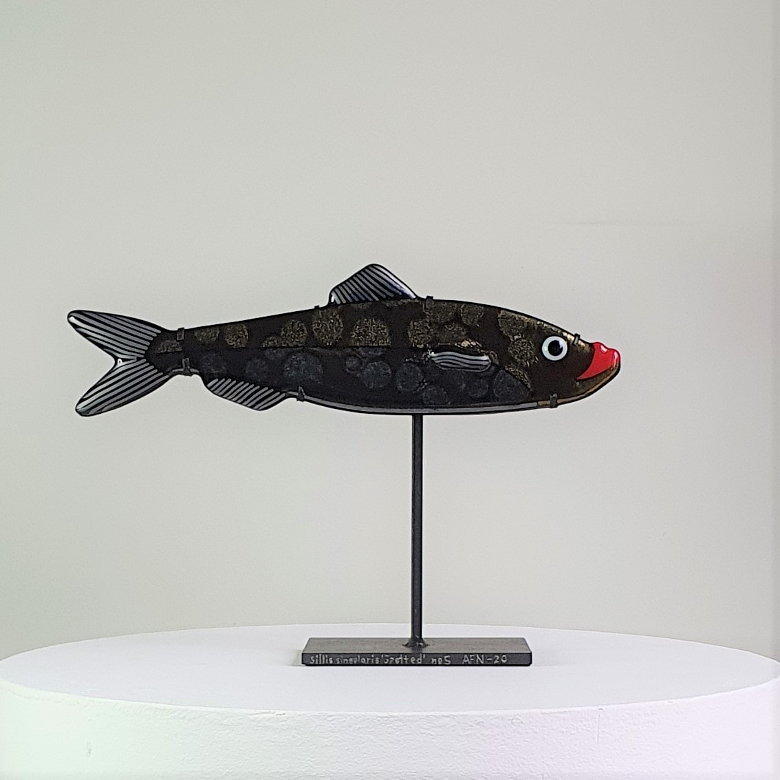 Herring in black opaque glass with an iridescent surface in gold and silver on the front. Thickness of glass, 6 mm. Dimensions of individual fish, c. H: 8 cm W: 30 cm. Head to the right.